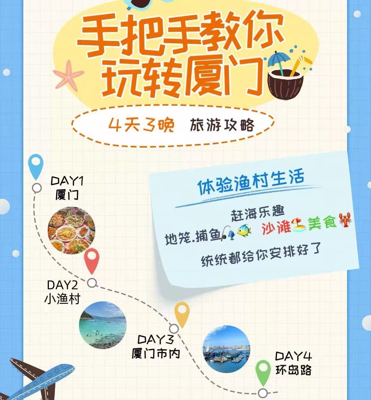 早上跟随教练出发厦门小渔村,漫无边际滩涂,弯弯如月的渔船。排排成立的生蚝海蛎田。渔民就靠此为生。换上渔靴,戴好帽子,背上渔篓,手戴手套,握着铲子冲向滩涂。聆听教练的科普,对面的金门列岛。肉眼直击,渔民海上放牧的野生花蛤。接着前往【围网捕鱼】(游览时间不少于30分钟)用渔民千百年的捕鱼方式体验一把。潮水退去,渔网里面就留有各种各样的海货。海蟹/海鱼/海怪/皮皮虾。都有机会映入眼帘,盯好海货,提前下手。提着收获前往餐厅免费加工享用午餐。之后前往码头随着潮水起落,抛下【地笼】,寄好绳,做好属于自己的标志。静候海蟹跟随秘制饵料。海蟹爬行进去,倒行无路,静候海货,(游览时间不少于30分钟)台湾珊瑚馆位于金门邮轮隔壁。是连接台湾和厦门的一个重要的标志性场馆。让我们一起了解海底珊瑚的形成,接着前往厦门帆船中心体验【帆船出海】/[+100元/人可享受私人游艇出海](乘坐时间不少于40分钟),杨帆起航,5-10人一艘。可缓可急,全由您自行和船长商量把握。收完笼子带着美好的心情回程。行程期间额外赠送【沙滩赶鸭】【沙滩高尔夫】【沙滩放风筝】另有精美奖品赠送。