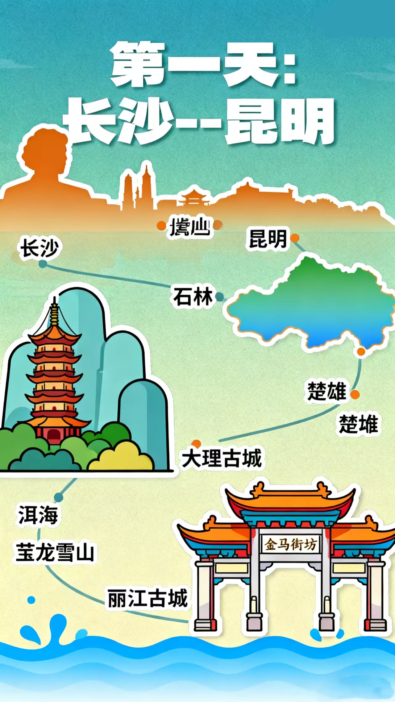 1、交通:长沙—昆明往返经济舱,含机场建设及燃油费;当地空调旅游大巴