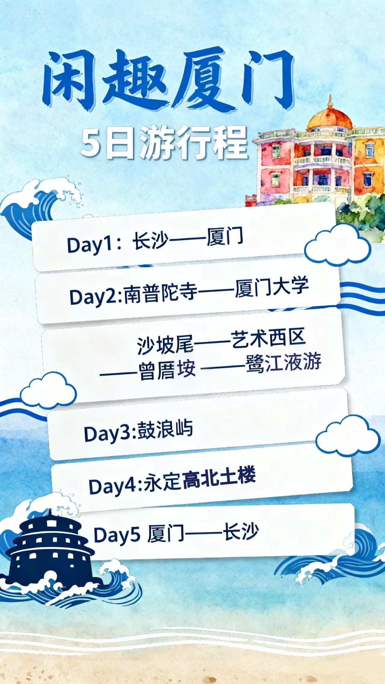 • 交通:长沙—厦门往返经济舱机票(含机场建设及燃油费);当地空调旅游大巴