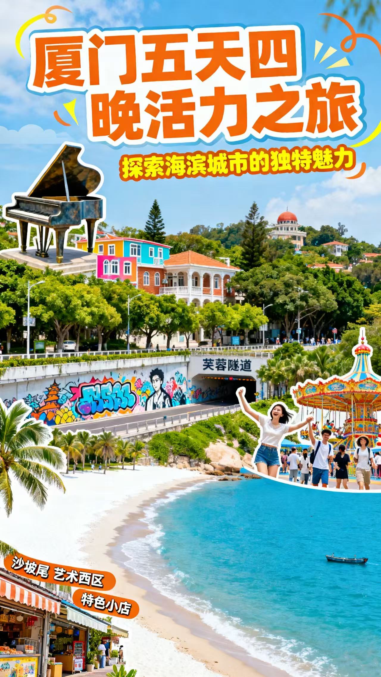 车览【彩色环岛路】沿海而建,全程31公里,路宽44-60米,本地人又叫它五色路:蓝色的大海、金色的沙滩、绿色的草地、红色的跑道、灰色的公路,它是来厦门必去的一个地方。前往游览环岛路上的美丽小渔村【曾厝垵】这里没有鼓浪屿的嘈杂,没有市区的繁华,也没有一波接一波的游客,有的只是质朴的民居和文艺小清新的店面,当然,还有不混乱的酒吧。如果说选一个值得留念的地方,那么会想:一定是它——曾厝垵。