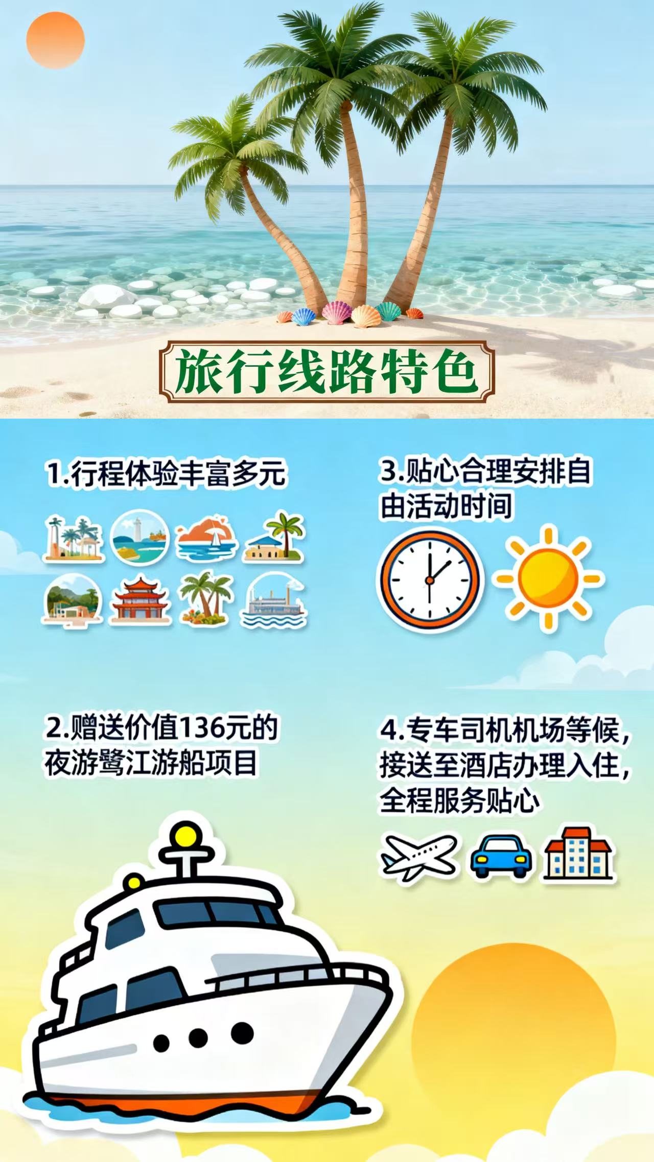 指定时间集合,赠送价值136元的【夜游鹭江】游船(赠送项目不去不退),为了此次金砖会议,厦门1400个夜景工程全部点亮!鹭江夜游将演武大桥、中山路、厦大学生公寓,世贸双子塔等,欣赏厦门绚丽夜景的新视角,尽情感受厦门美丽夜景。后集合返回入住酒店。