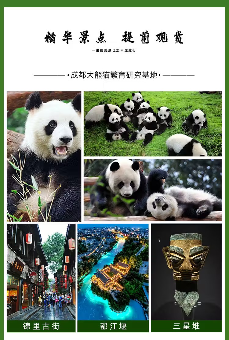 门票及地面项目;景区景点/场馆内收费参考:都江堰景区景区/场馆小交通、都江堰景区讲解费、青城山景区,/场馆小交通、成都大熊猫繁育研究基地景区/场馆小交通;