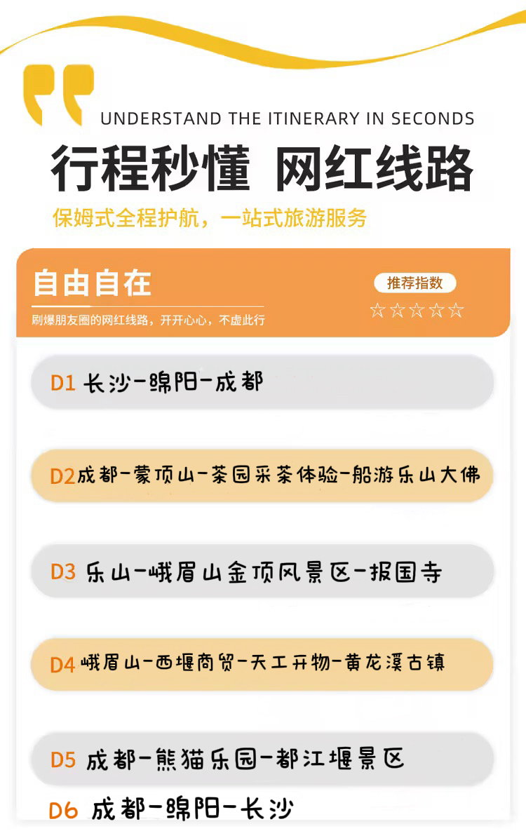 1、游客自行离团退团费用恕不退还; 2、费用不含自理景点以及一切私人消费; 3、具备门票优惠政策的游客请带好有效证件,按我社相关折扣退还门票差额; 4、如遇人力不可抗拒的因素(如下雨雪天,地震、塞车等等)而使行程改变或时间改变或景点减少,本社负责没有产生的门票退还门票款,由此产生的费用自理,本社不承担由此造成的损失及责任; 5、请游客认真填写意见书,我社将以自填的意见书作为处理投诉及反馈为依据 。 6、购物安排: 行程日期安排购物场所名称活动停留时间项目简介D4西堰商贸约120分钟翡翠D4天工开物约90分钟水晶7、景区配套便民交通收费情况: 行程日期景区配套便民自费设施价格说明D3峨眉山观光车往返90元/人必须自理D3峨眉山索道金顶往返120元/人建议乘坐D2蒙顶山索道往返30元/人游客根据自身身体状况决定是否选择,可委托导游代购,也可以自行在景区售票窗口购买D5都江堰景区停车场至都江堰景区电瓶车单程10元/人,往返20元/人D5都江堰讲解耳麦10元/人D5都江堰景区内电瓶车15元/人D5熊猫乐园电瓶车及讲解费35元/人D5都江堰观光大扶梯40元/人 |