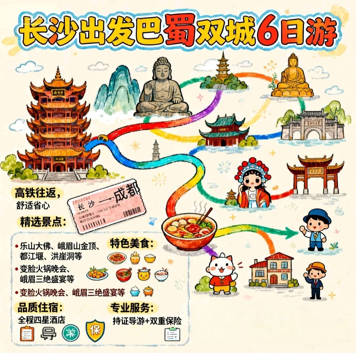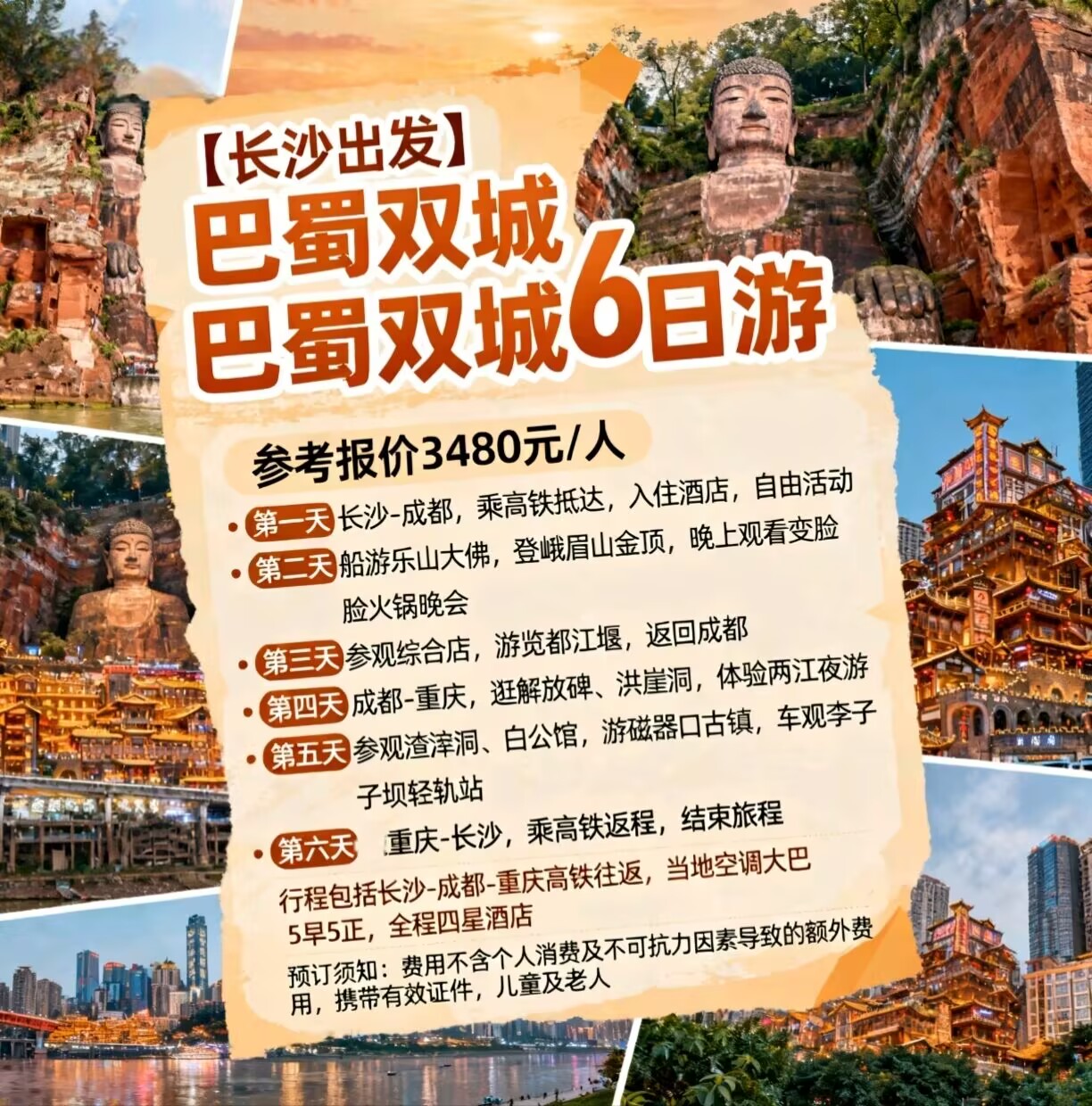 1、交通:长沙-成都,重庆-长沙往返高铁二等座;当地空调旅游大巴