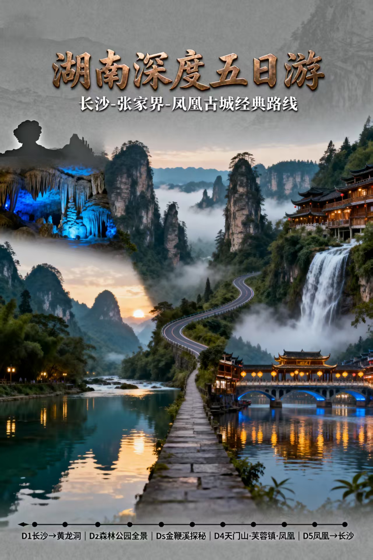 该线路串联起张家界的武陵源砂岩峰林、天门山玻璃栈道等自然奇观,以及凤凰古城的吊脚楼、沱江夜景等人文景致,还包括芙蓉镇瀑布景观和矮寨大桥工程奇观等,形成 “自然奇观 + 人文秘境 + 工程史诗” 的立体体验。