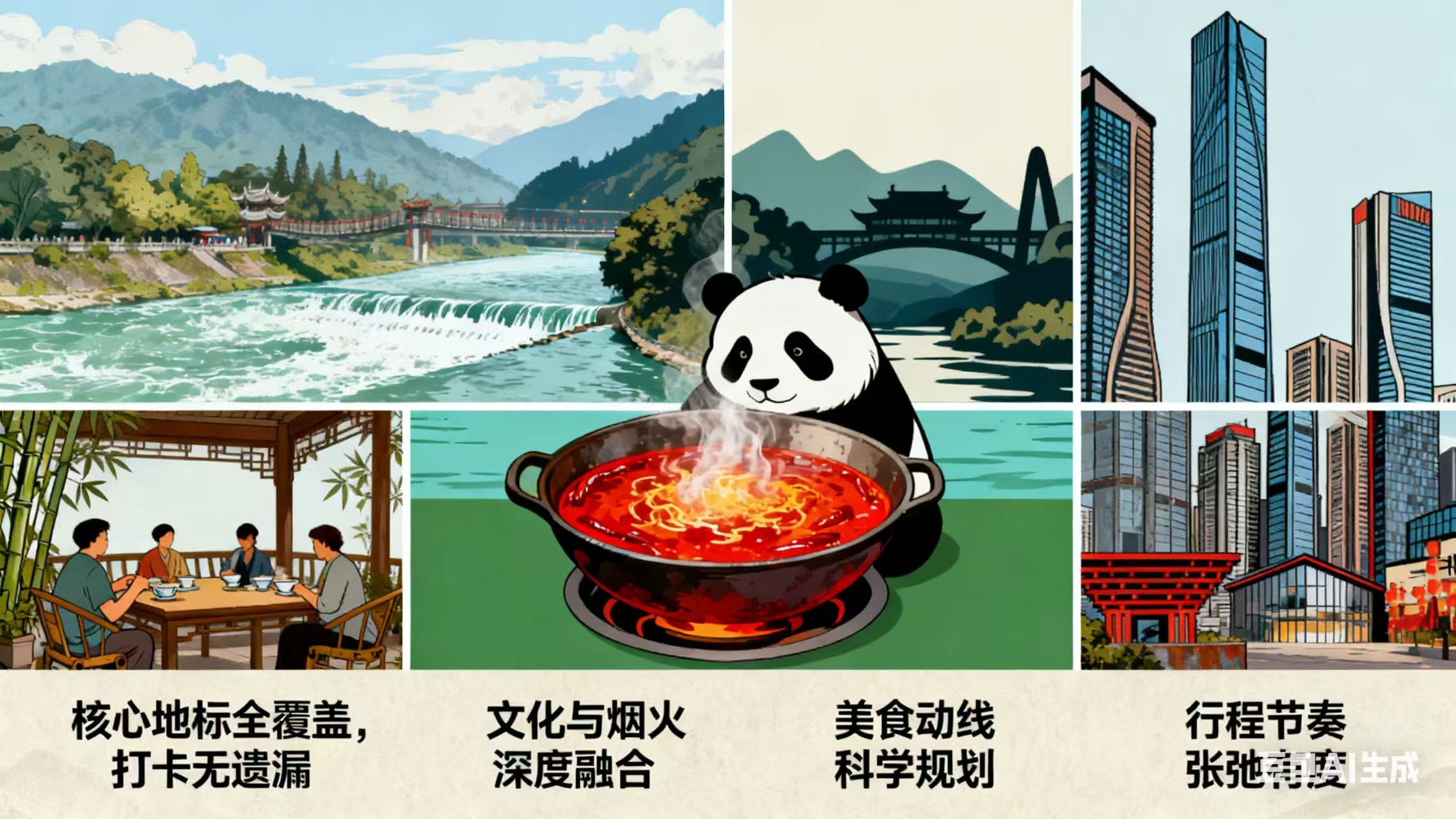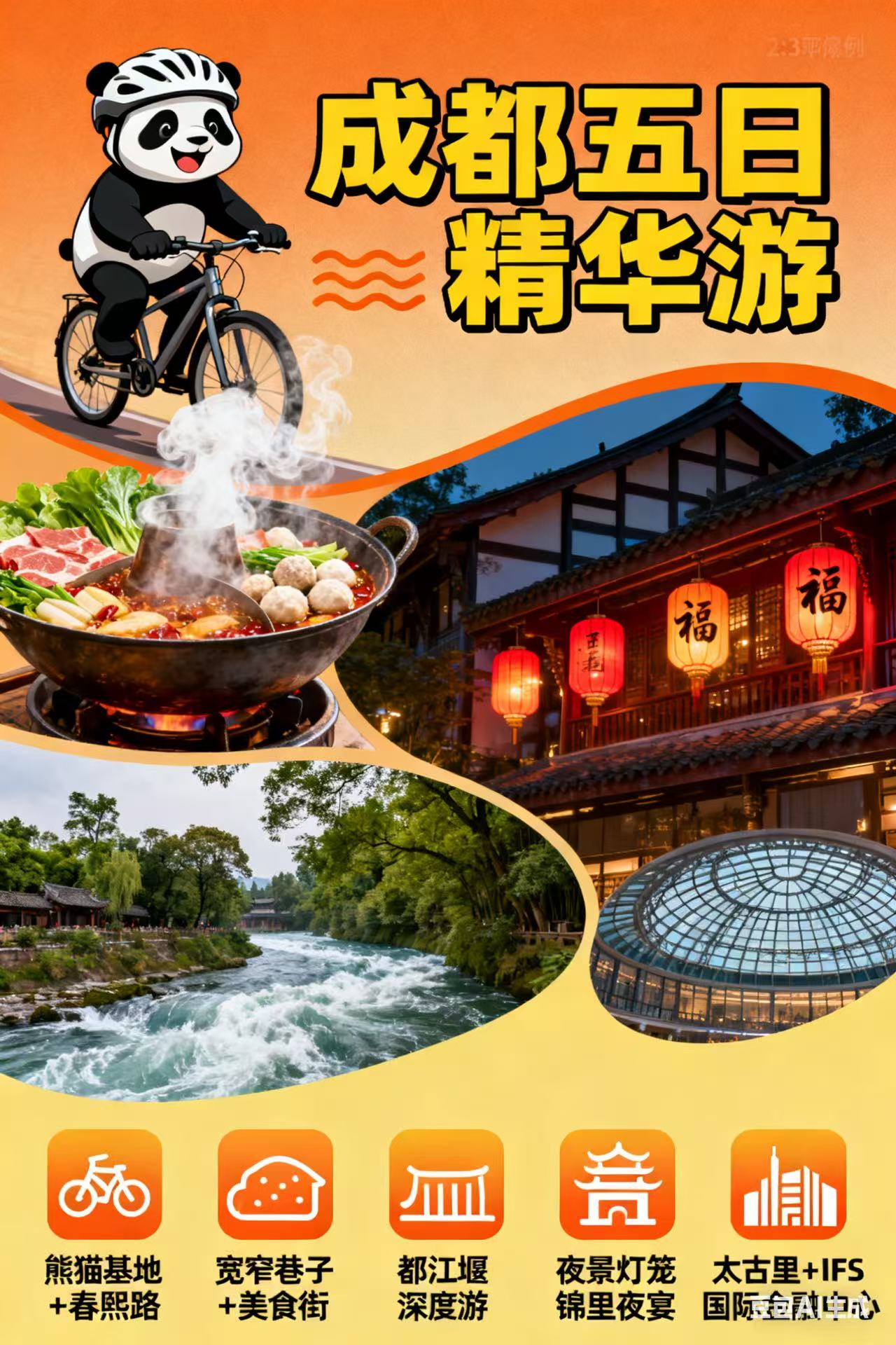 鹤鸣茶社—熊猫邮局—宽窄巷子—玉林路—空港花田—黄龙溪—夜游锦里