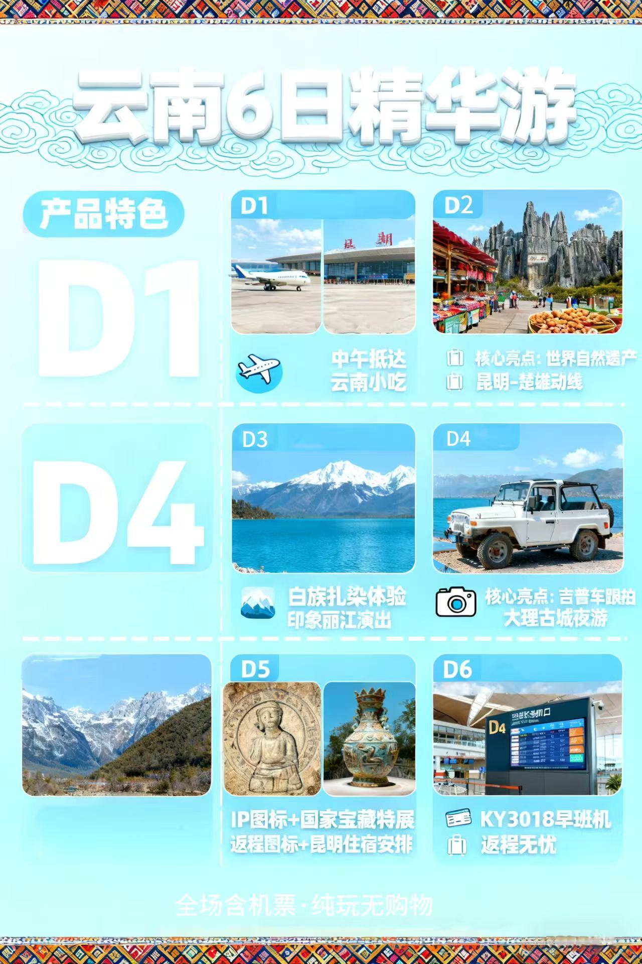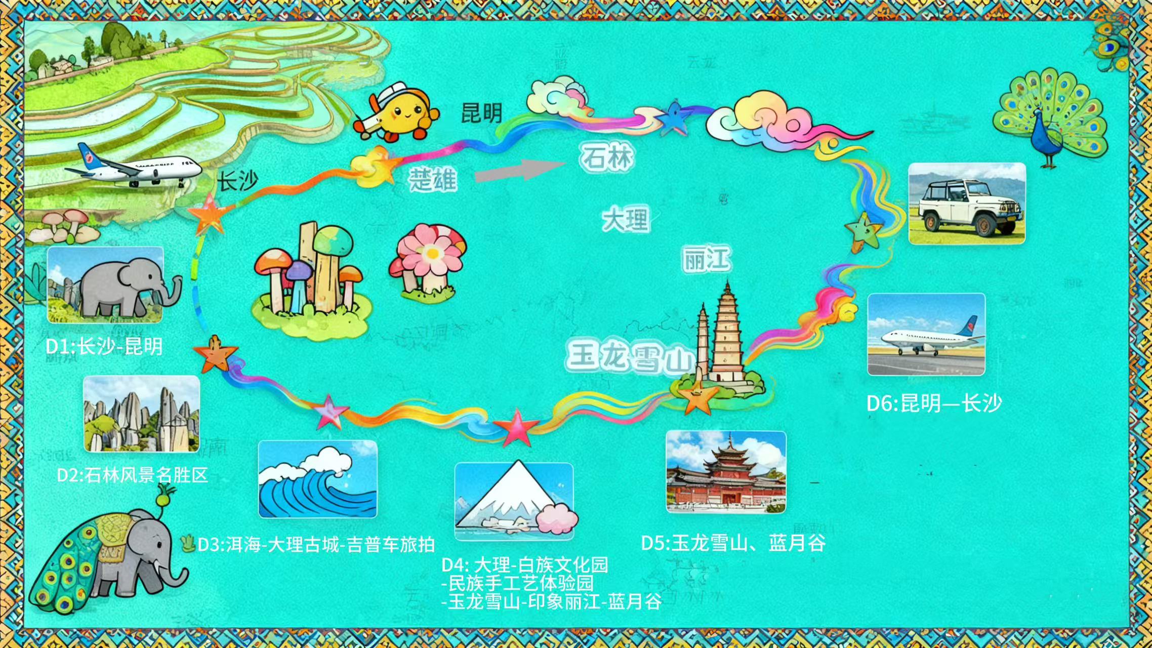 1、交通:长沙—昆明往返经济舱,含机场建设及燃油费;当地空调旅游大巴