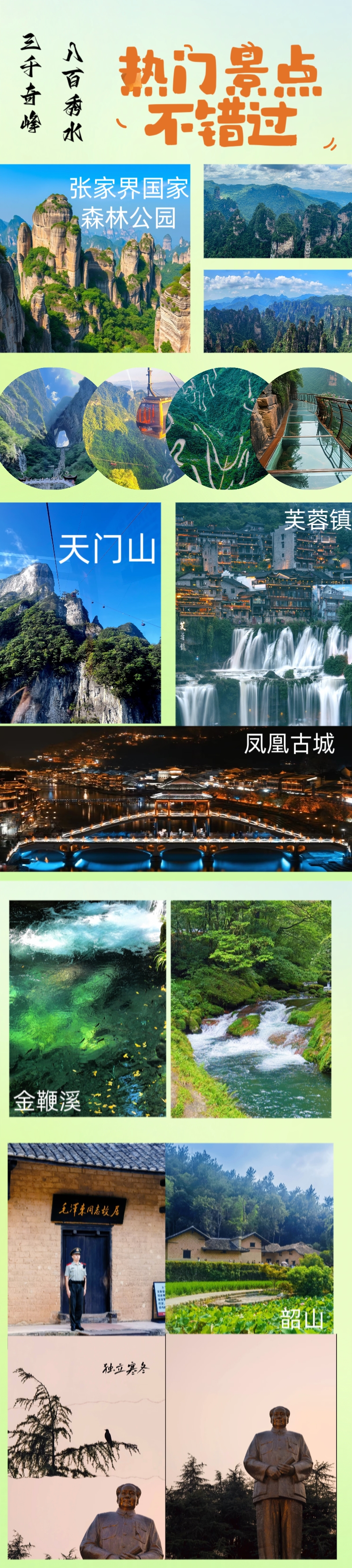 9:30-15:30 乘车前往张家界,全程约350公里,车程5小时左右,中途设置1-2个服务区休息(各20分钟),方便游客用餐、如厕。