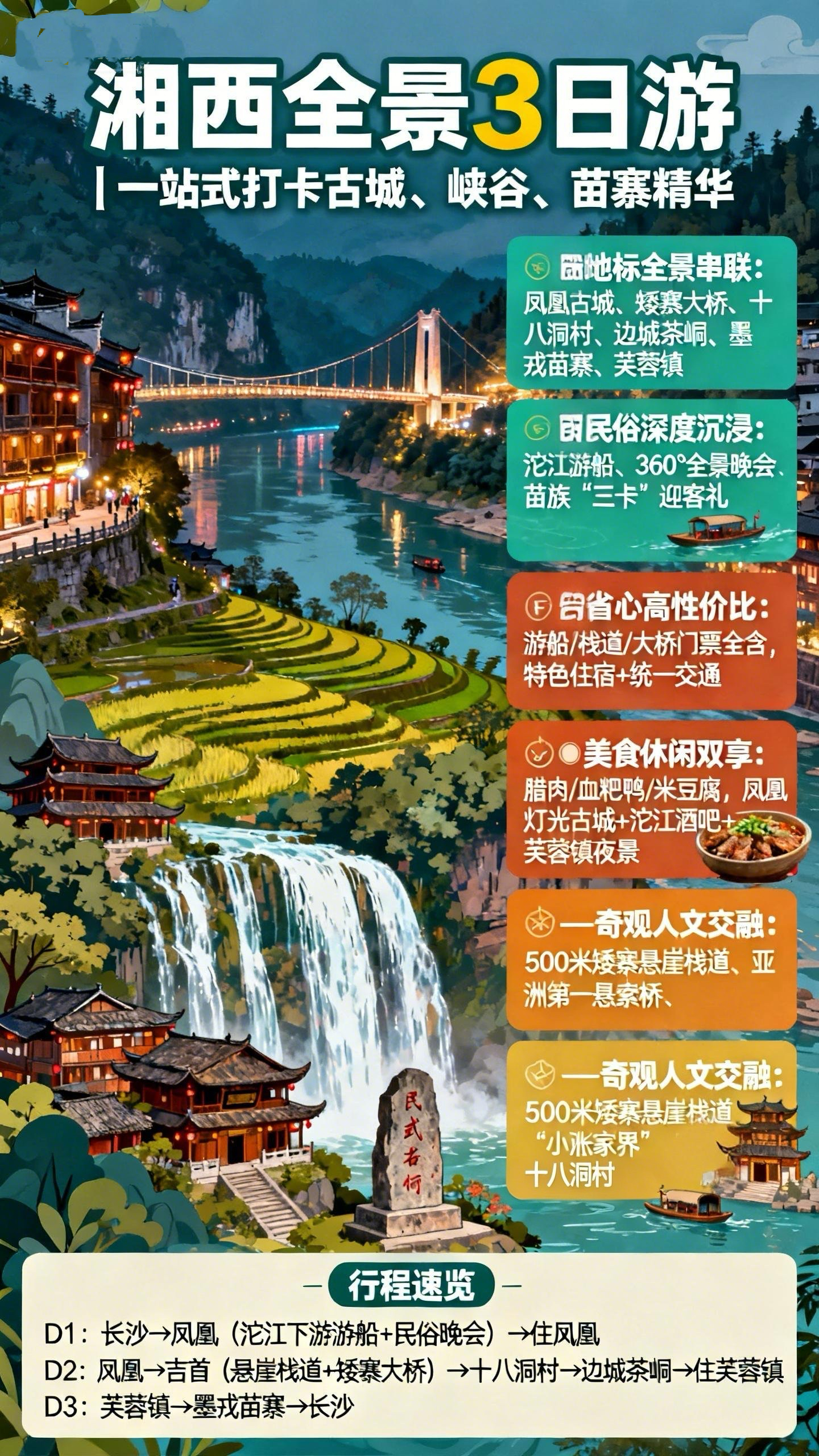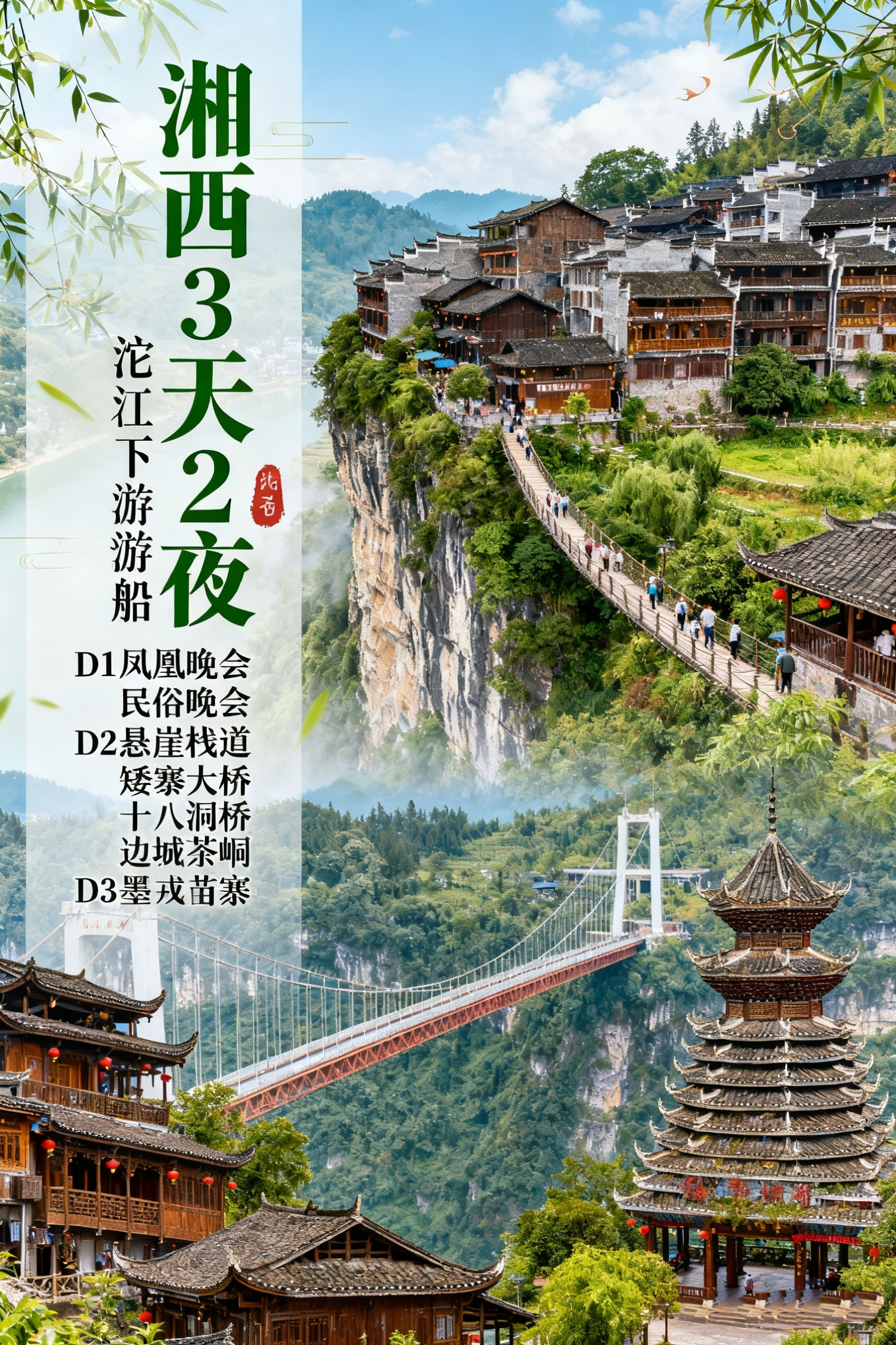 情人桥启航、雾桥发呆、廊桥遗梦、红桥怀旧。后乘车前往参观【民俗晚会】(门票已含),通过实景舞台、情景舞台、悬崖舞台打造中国首创360度全景体验剧。晚餐后在酒店休息或自由活动,也可自费欣赏《魅力湘西》大型演艺(228元/人起,观看时间不少于1.5小时),感受神秘湘西的千年巫傩文化,探寻屈原笔下诡异的楚风遗俗,神秘的湘西赶尸,评鉴中国入座排行第一的旅游视听盛宴。