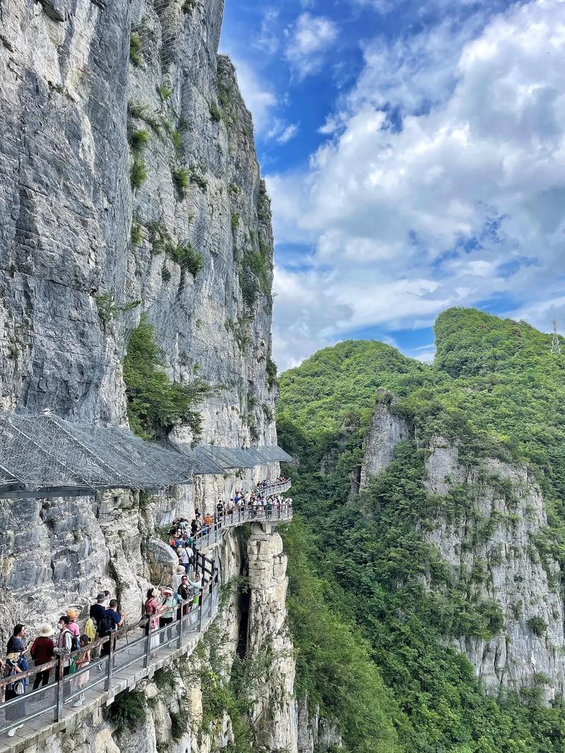 后乘车前往矮寨奇观景区,游览【悬崖栈道】(门票已含),全长1.5公里,垂直落差500米,采用现代设计语言,萃取“蝴蝶”、“飘带”等苗族文化元素,以期形成戏剧性“跌宕起伏”、“惊心动魄”的旗帜性游步道系统。游览悬崖栈道时不仅可以欣赏到山高谷深、崖陡壁俏、林深路幽、巍峨险峻的武陵山脉中最精彩、最险峻、最梦幻的地段,更有天桥(矮寨大桥)、天路(公路奇观)、天台(天问台)交相辉映、互为景致,移步入云,一步一景,构成人文与自然共生,壮丽于精巧同在的峡谷奇观。后至【矮寨大桥】(门票已含),乘观光电梯至大桥观光通道,近距离观亚洲第一的斜拉式铁索桥矮寨大桥,桥面设计标高与地面高差达330米左右。桥型方案为钢桁加劲梁单跨悬索桥,全长1073.65m。悬索桥的主跨为1176m。该桥跨越矮寨大峡谷,主跨居世界第三、亚洲第一。矮寨公路奇观一览无余,让您美景中感叹的祖国的强大。