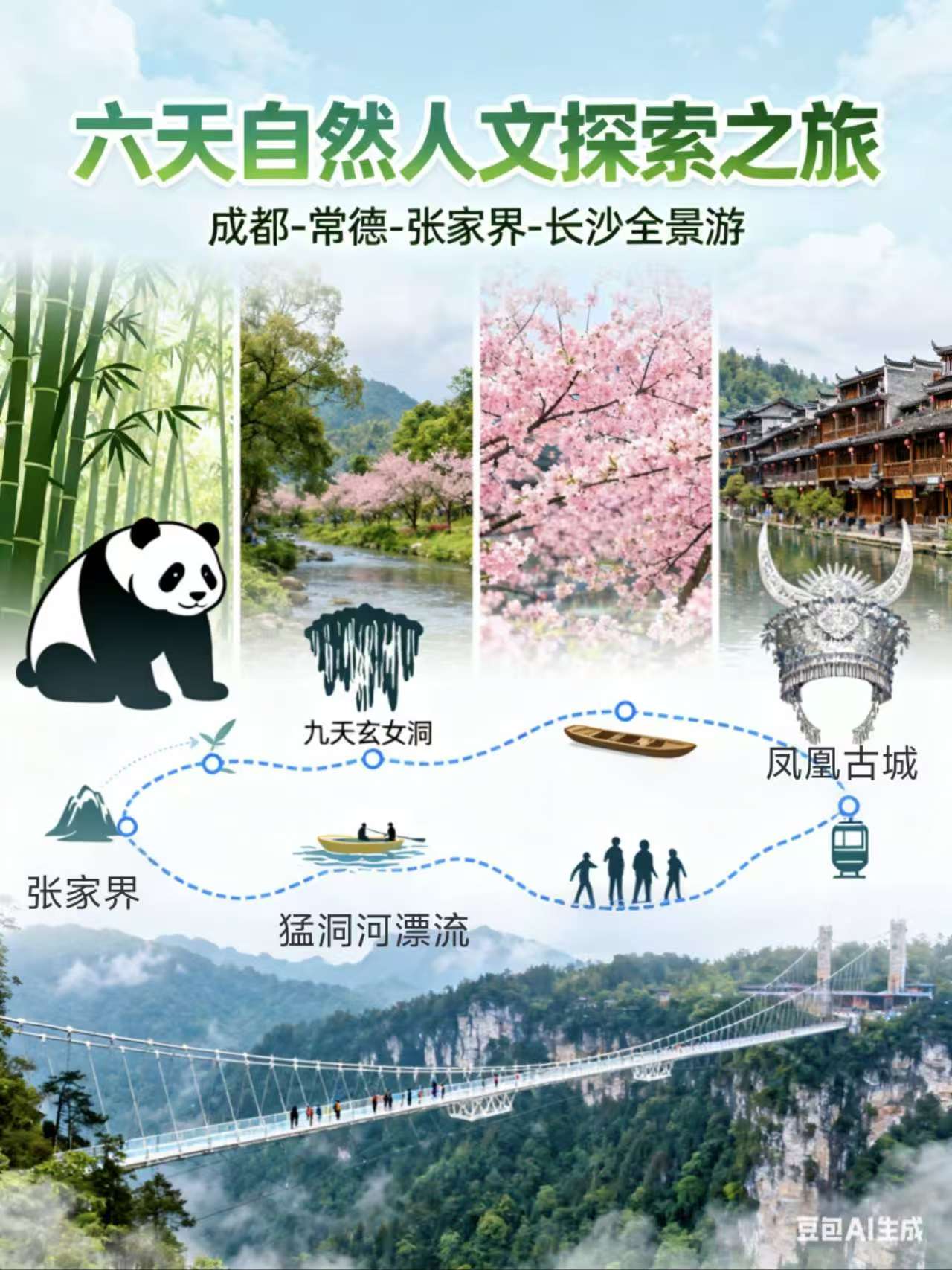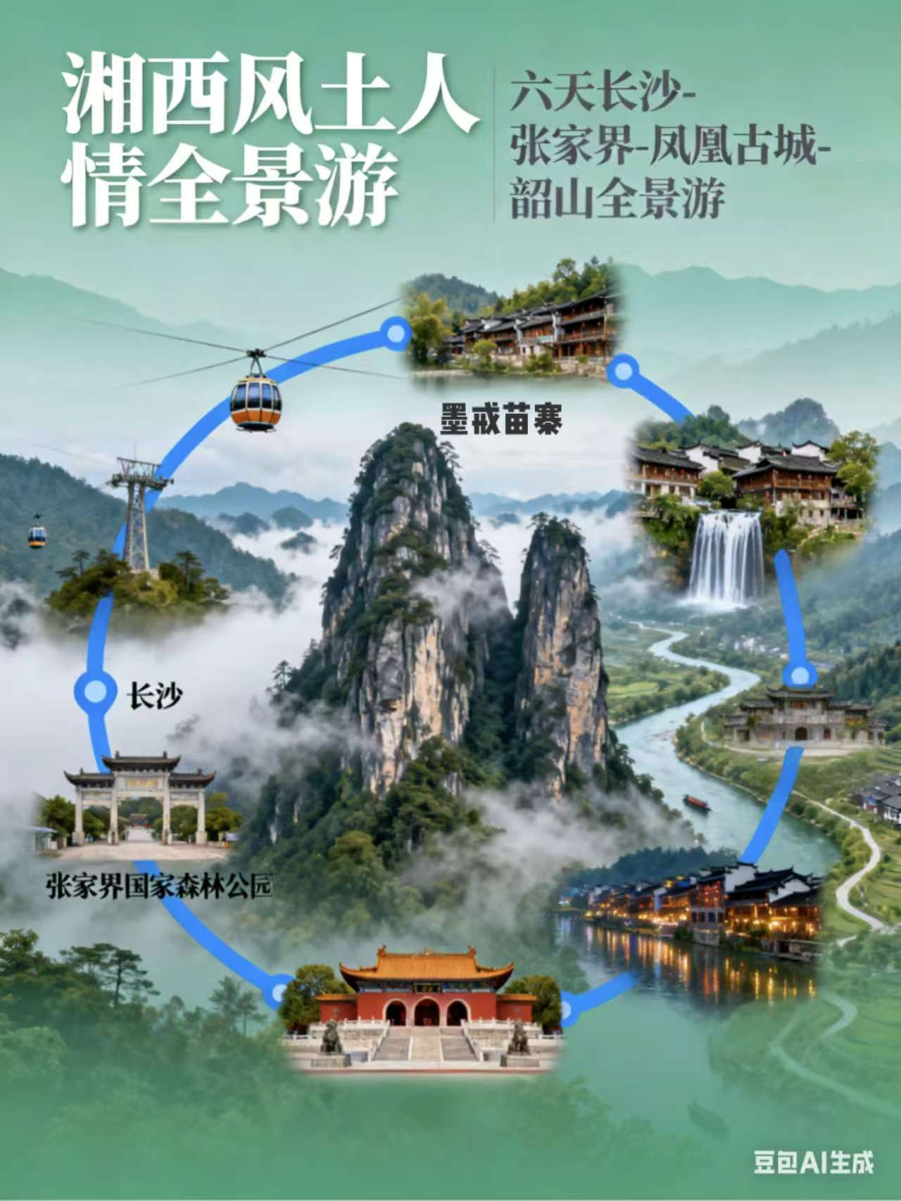 行程 | 部分景点如“禾田居山谷”“袁家界景区”等,需确认是否有适合儿童的游览方式,是否存在体力消耗较大的路段,提前做好亲子游行程调整准备;涉及的影视取景地(如芙蓉镇、《阿凡达》取景地)可提前给孩子做背景知识铺垫,提升游览趣味性。 |