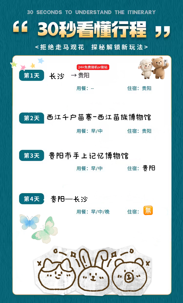 1、交通:长沙—贵阳往返经济舱,含机场建设及燃油费;当地空调旅游大巴 2、住宿:经济连锁酒店 3、用餐:5早7正 4、导服:优秀持证国语导游讲解服务 5、门票:含行程首道大门票 6、保险:旅行社责任险、旅游人身意外险 |