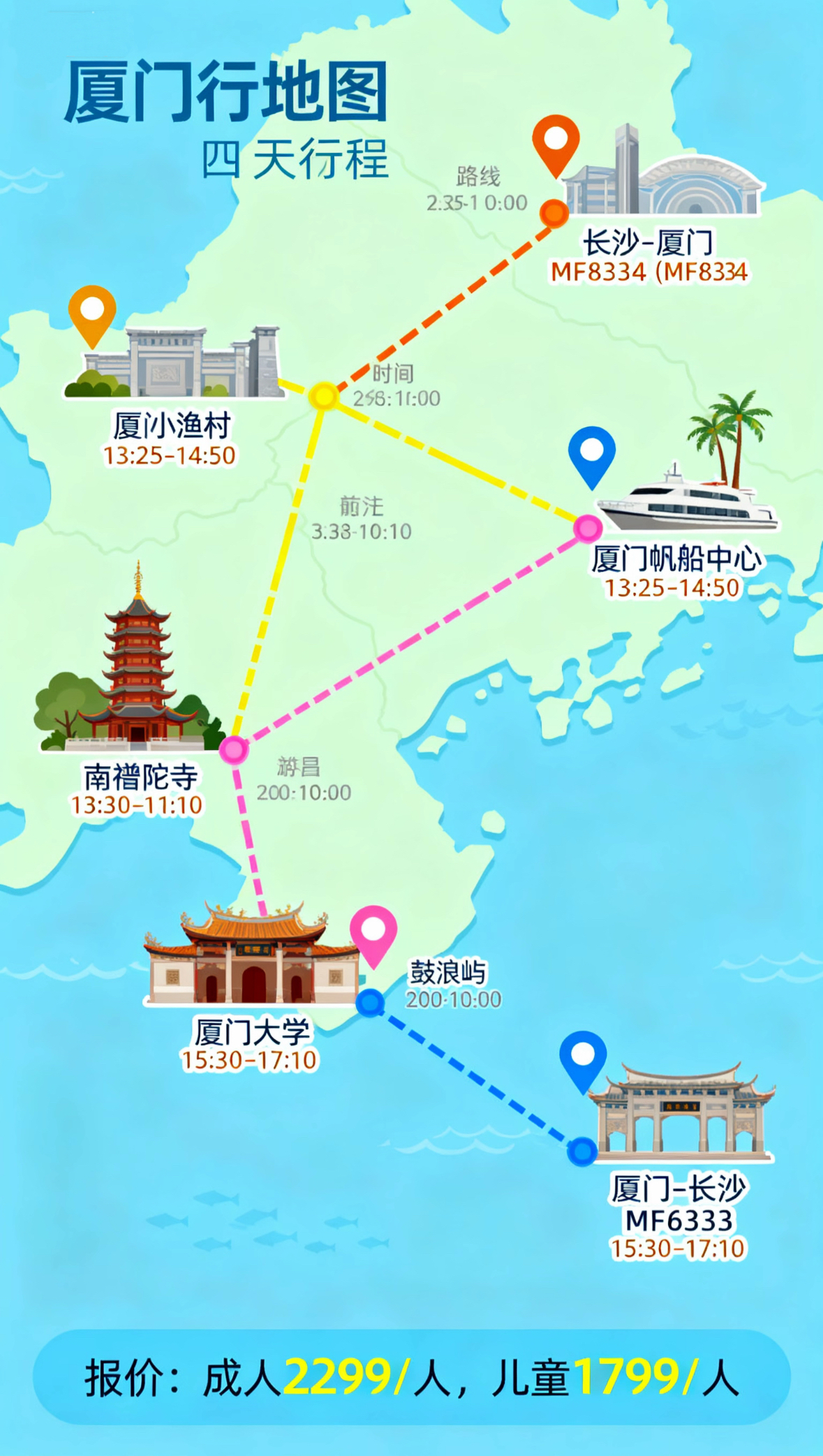 1、交通:长沙—厦门往返经济舱,含机场建设及燃油费;当地空调旅游大巴