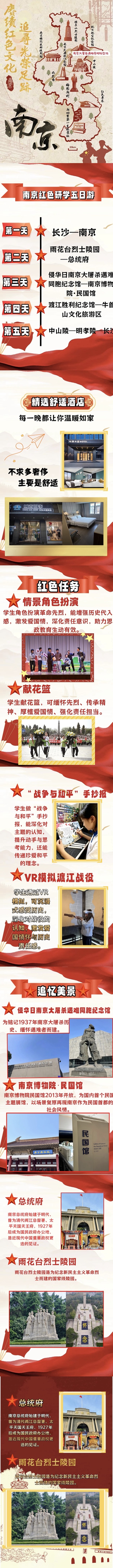 早上8:30酒店早餐后出发(车程约0.2h)雨花台烈士陵园(游览约3h)向烈士纪念碑敬献花篮,集体朗诵《就义诗》,参观《雨花英烈生平事迹展》并分组制作“烈士名片”在烈士就义群雕前分享12:30用餐(约1h)后前往总统府(游览3h)观察清代两江总督署与民国政府建筑风格融合。体验历史穿越发放《民国人物卡牌》,扮演孙中山、宋子文等角色,在西花园开展“民国新政讨论”情景剧。17:30晚餐(约1h)用餐后返回酒店,19:30进行红色故事会分享雨花英烈故事,评选“最佳讲述者”。