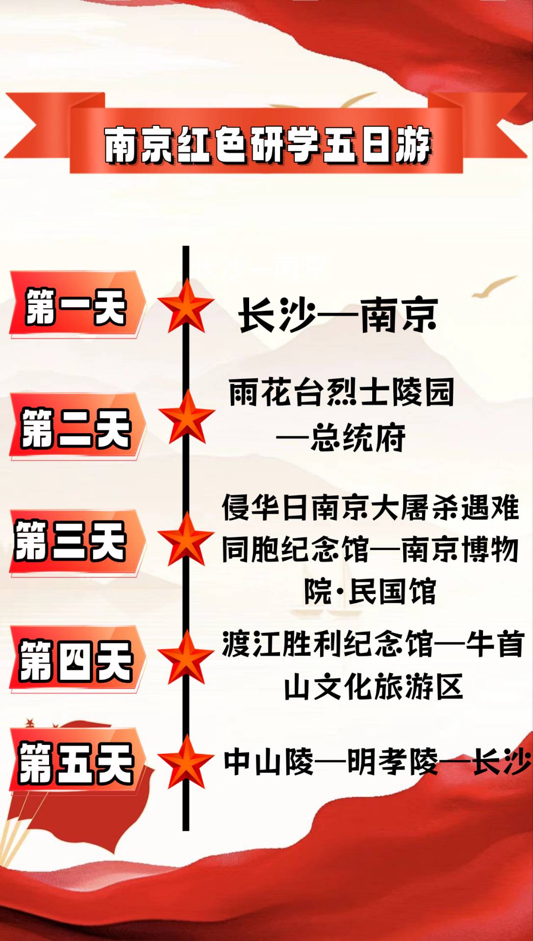 早上8:00酒店早餐后前往(约1h)中山陵明孝陵(游览约2h)在中山陵徒步中轴线,在祭堂聆听“天下为公”题词解读,小组竞赛回答辛亥革命关键事件,探访石象路、长生鹿苑,对比朱元璋与孙中山的历史地位,完成《明清皇家陵寝建筑特征》笔记11:30午餐(约1h)用餐后13:00前往(约1h)南京长江大桥(游览1h)在观景台介绍大桥建设背景(1968年建成,中国第一座自主设计公路铁路两用桥),观察桥头堡“三面红旗”雕塑。15:30前往(车程约1h)南京禄口机场(ZH8574/18:05—19:55)至长沙黄花机场