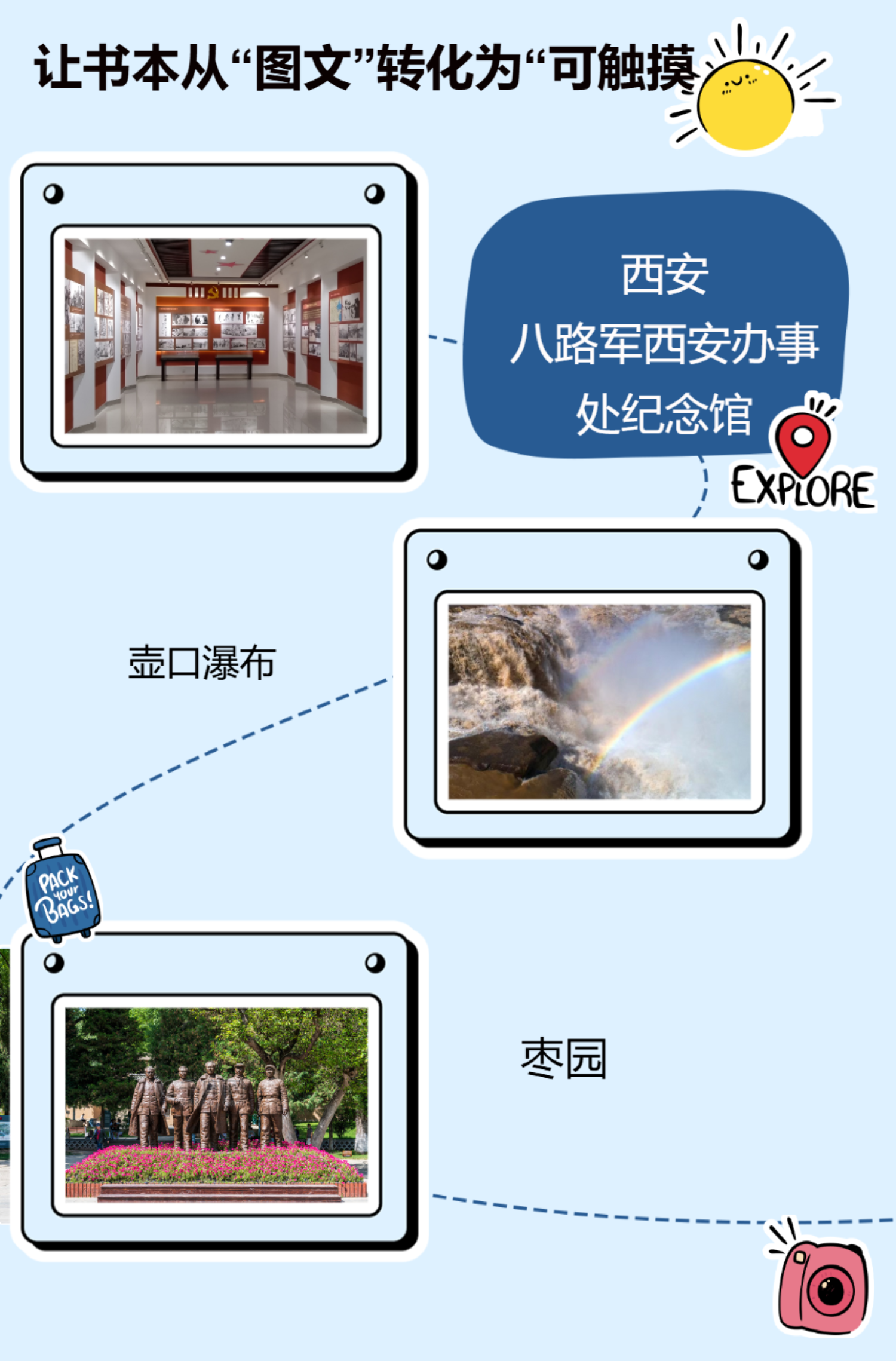 门票:八路军西安办事处纪念馆、杨家岭革命旧址、枣园革命旧址、南泥湾革命旧址、壶口瀑布、照金革命纪念馆、陕西历史博物馆、西安事变纪念