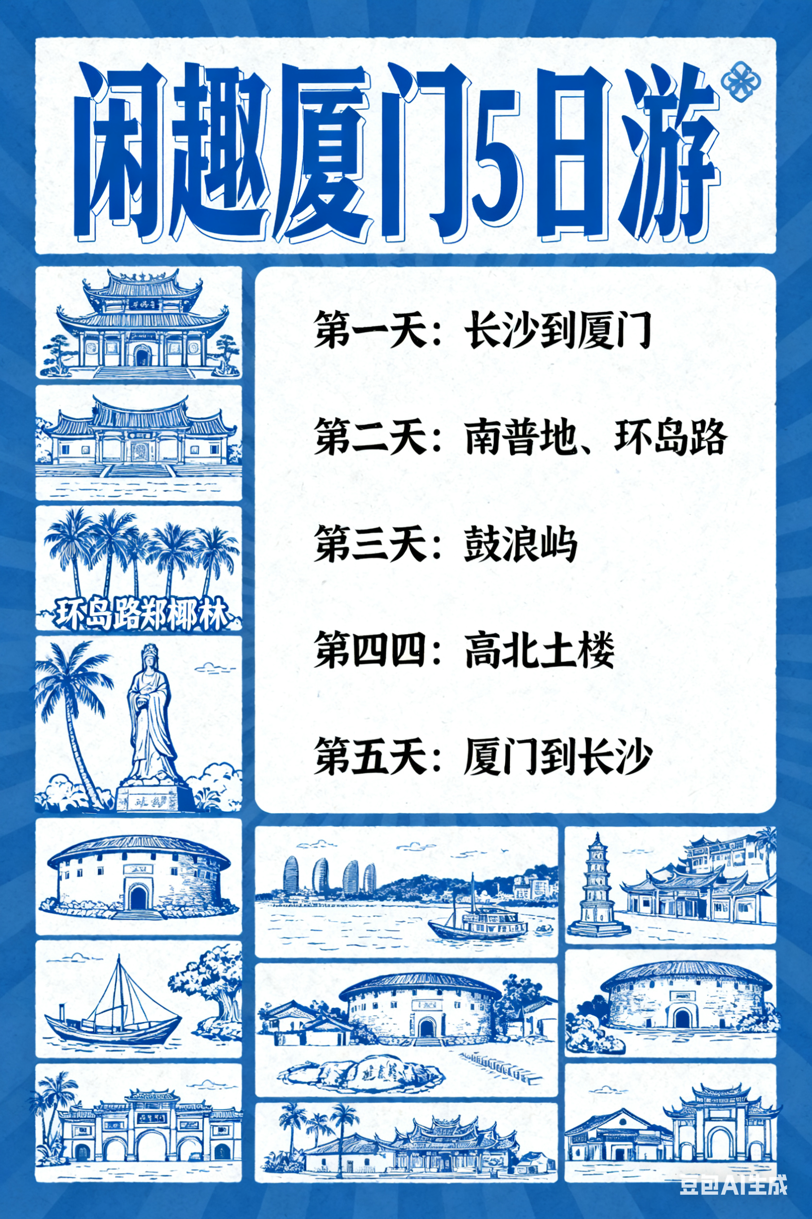 1、交通:长沙—厦门往返经济舱机票,含机场建设及燃油费;当地空调旅游大巴