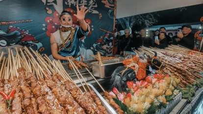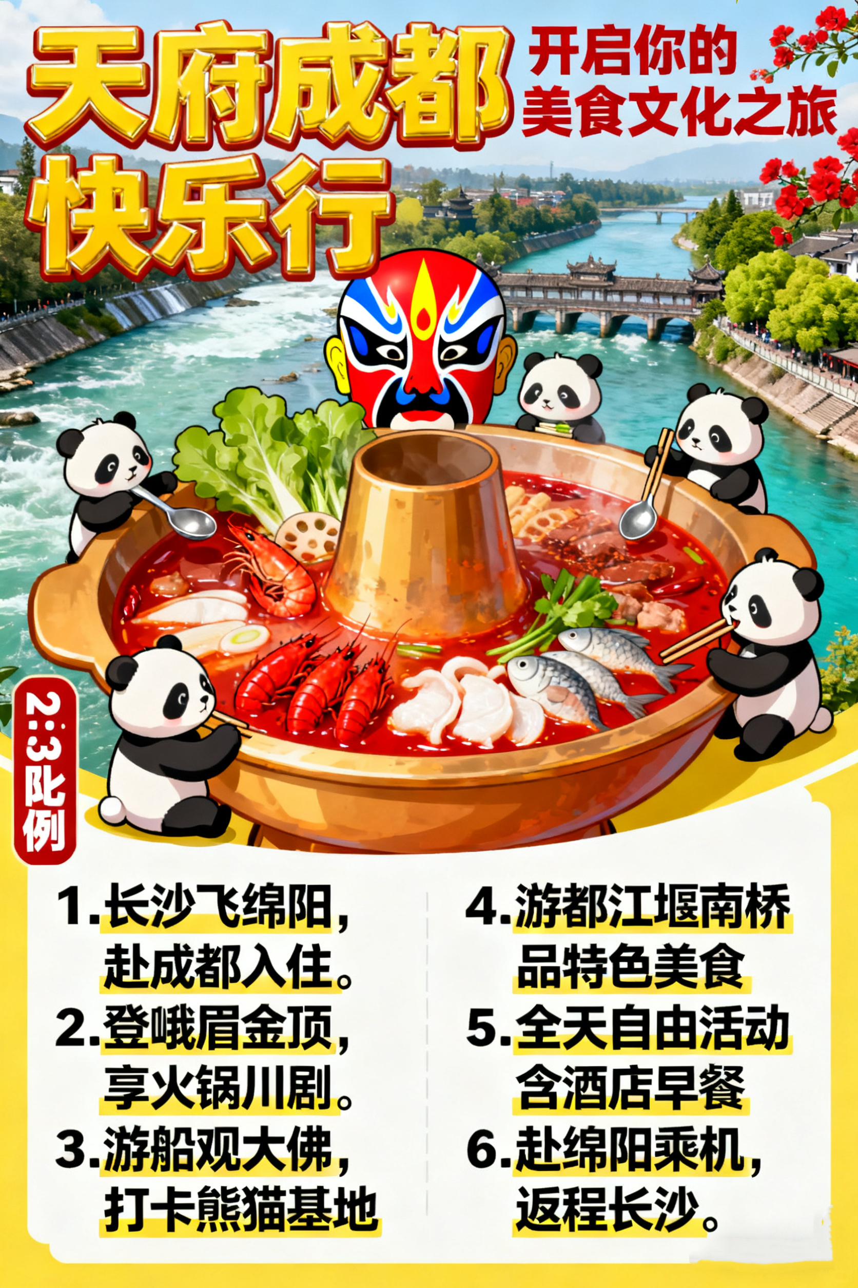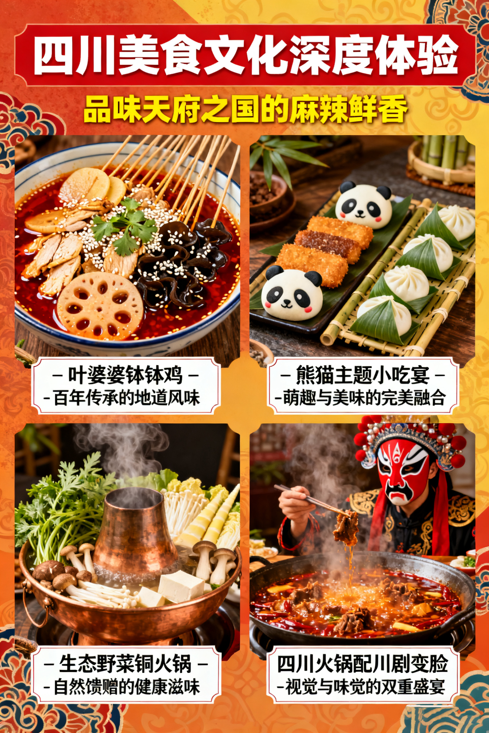 晚餐享用【熊猫主题小吃宴】:专属定制,精挑细选每一道本土小吃,吃的就是经典!凉菜:伤心凉粉、口味凉面,泡菜什锦;热菜:火锅冒菜,鸡汤耙耙菜,滋补银耳汤蒸笼:粗粮,川西羊疙瘩,一品熊猫包,椒香手撕鸡,天府叶儿粑,香酥烤鸭,川味干锅。都江堰必吃小吃:【叫花鸡腿】皮薄肉嫩,外配荷叶点缀,十里飘香。