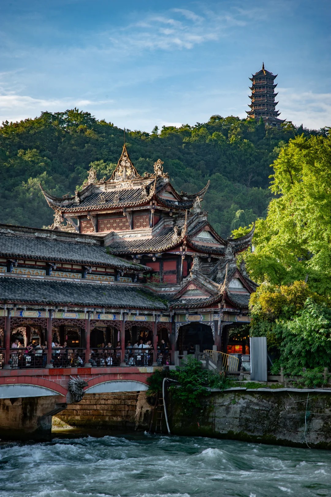 午餐后参观世界文化遗产、旷世奇功—【都江堰水利工程景区】(景区内外观光车30元/人,费用自理),乘坐古城区观光车到达都江堰离堆公园大门,都江堰水利工程由蜀郡守李冰于战国秦昭王时期(公元前 227 年)在岷江上修建的中华第一古堰,被列为“世界文化遗产”:宝瓶口引水口、飞沙堰泄洪坝、观鱼嘴分水堤,过安澜索桥,颇为壮观,还可参观 5.12 地震重建的的秦堰楼、纪念李冰父子的二王庙。可选择搭乘玉垒阁观光扶梯(40元/人,费用自理)至玉垒阁观都江堰壮丽全景。相伴千年古堰的【灌县古城】是一座景城一体的古城,一座品味生活的古城。登玉垒看浮云、依南桥赏宝瓶、上文庙拜孔圣临内江品夜啤、逛杨柳河休闲大美古城入画来,处处留下了游人由衷的赞叹。随后来到都江堰宝瓶口以南的【西街】小巷,与伏龙观隔江相望,是一条有着几百年历史的古街,是南方丝绸之路入藏的起点,被誉为古代茶马道上的第一街。西街小巷一路逛吃后来到【都江堰南桥】,是南街与复兴街之间的一座雄伟壮丽的廊式古桥。