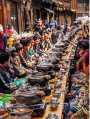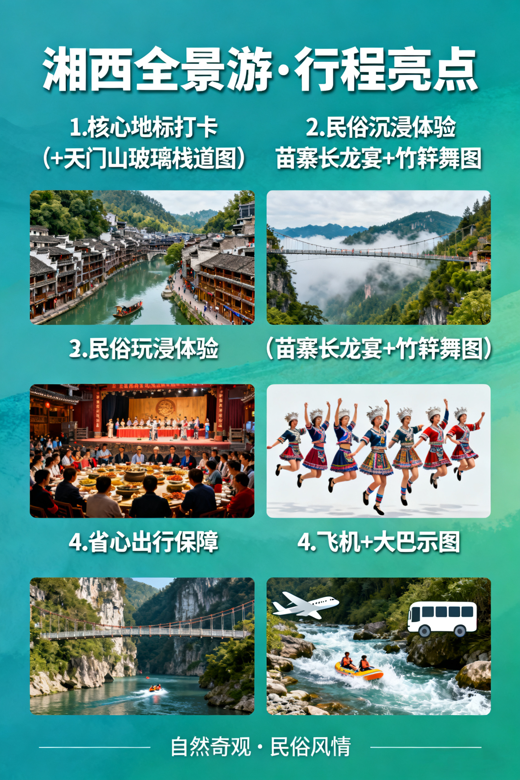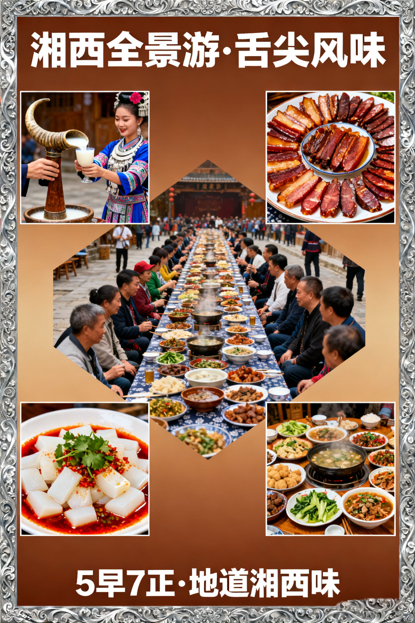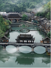 早餐后前往宋祖英的家乡、大湘西地区最大、最美丽、民俗风情最浓郁的国家AAA景区,被誉为“千里苗疆第一寨”——【墨戎苗寨】(门票已赠送)。对了歌、喝了酒、击完鼓,才能走进这个原始神秘的古苗寨,“竿子营”营房、烽火台流淌着历史的沧桑、苗族人的家国情怀、民族大义;去茶农家里品鉴最好的“有机茶”——“古丈毛尖”;打上了08奥运开幕式的墨戎“四方鼓舞”,会让您感受到战神蚩尤出征的震撼,秋实丰收的喜悦;精彩绝伦的各种苗族手工纺织、锻制技艺让人叹为观止;神秘的湘西巫术更会让您瞠目结舌、目瞪口呆……跳完竹竿摆手舞,就可以去体验苗家寨子里待客的最高礼遇——“长龙宴”了,那些热情的姑娘,一定要您对上苗家山歌之后,才会奉上筷子,和苗家阿妹一起载歌载舞,真正感受到苗族的人的真、善、美。