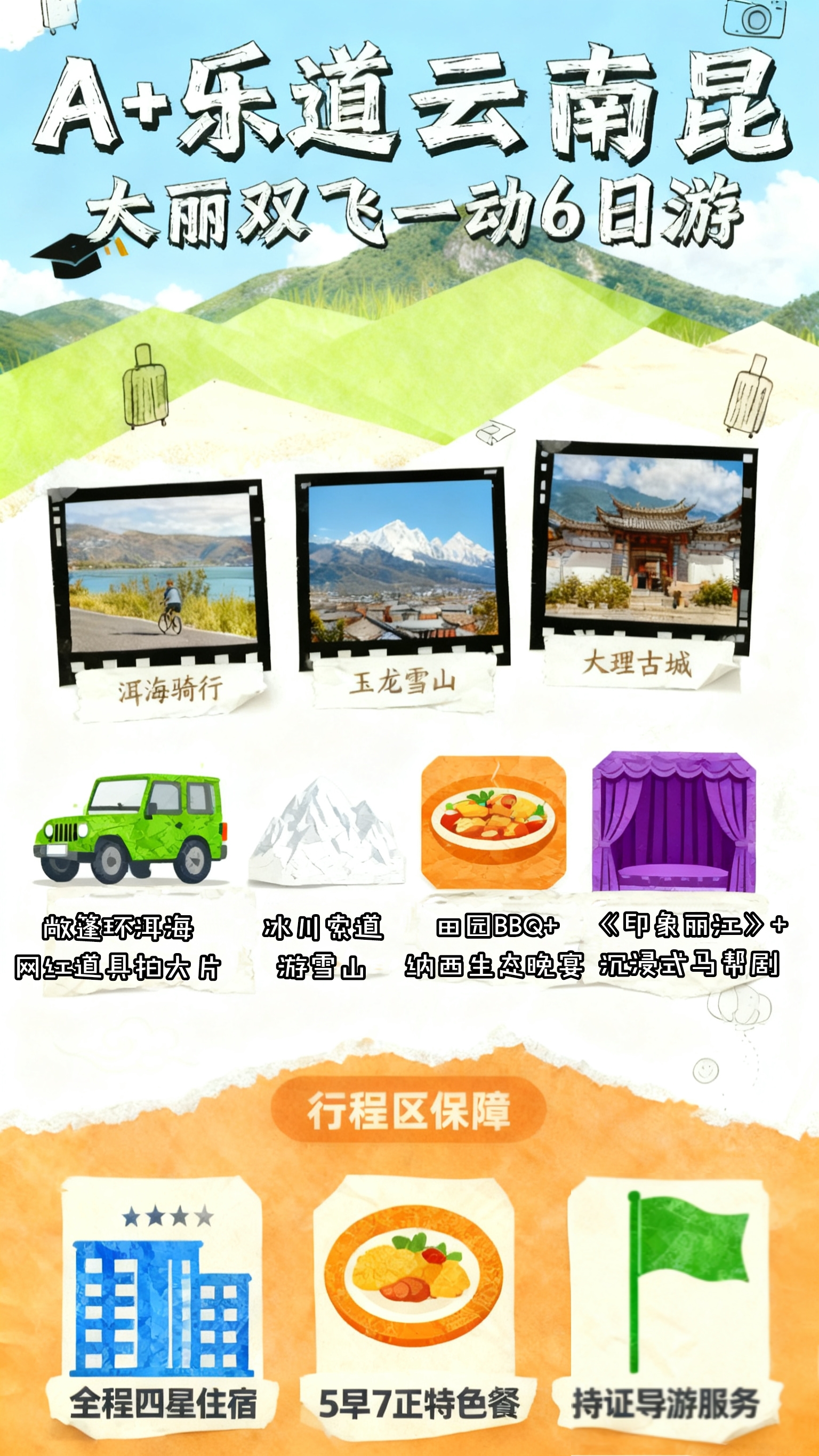服务 标准 | 1、交通:长沙—昆明往返经济舱,含机场建设及燃油费;当地空调旅游大巴 2、住宿:四星酒店 3、用餐:5早7正,餐标40元/人 4、导服:优秀持证国语导游讲解服务 5、门票: 含行程首道大门票 6、保险:旅行社责任险、旅游人身意外险 |