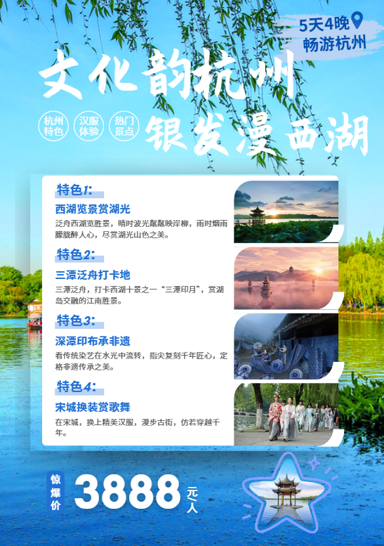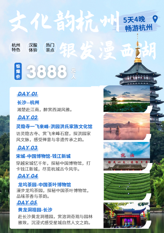 这条“文化韵杭州·银发漫西湖”线路,专为银发群体打造,深度融合杭州文化与休闲体验。可游西湖三潭泛舟、灵隐寺求符尝素斋、宋城换装赏歌舞、龙坞茶园采茶,还能体验非遗印染、丝绸文化。行程节奏舒缓,涵盖特色美食与舒适住宿,让中老年游客在漫游中感受杭州的历史底蕴与人文魅力,是一场兼具文化熏陶与休闲养生的银发专属之旅。