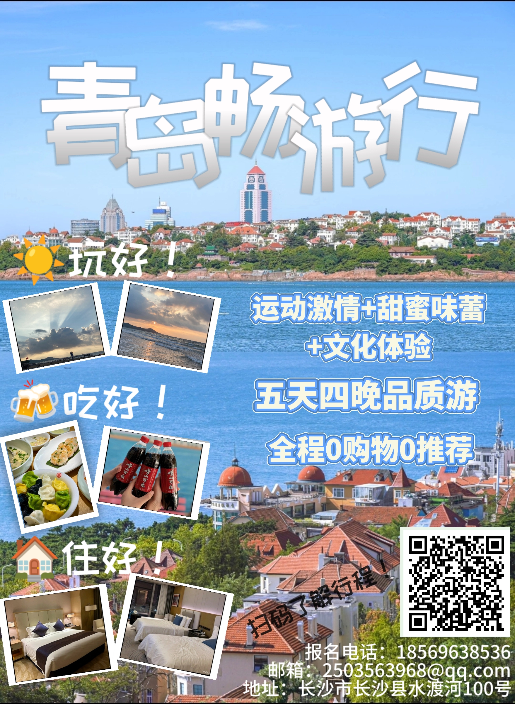 1、交通:长沙/青岛往返经济舱机票,含机建燃油费;当地空调旅游大巴