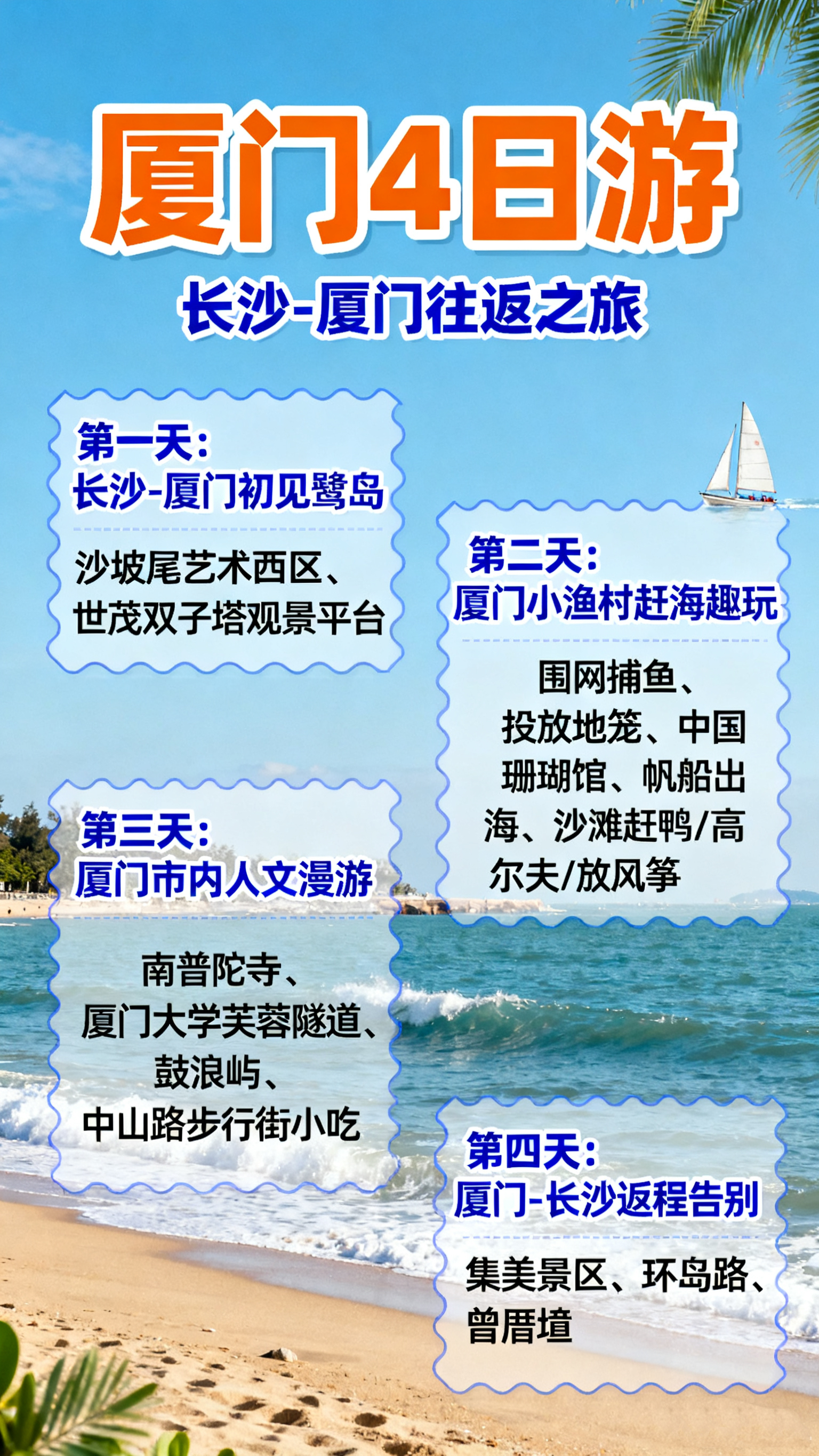 上午:游览【集美景区】,看陈嘉庚“穿西装、戴斗笠”风格建筑,逛鳌园、嘉庚故居、归来堂;之后漫步【环岛路】,欣赏海景与沙滩风光;最后前往【曾厝垵】,逛渔村小店、品特色美食。