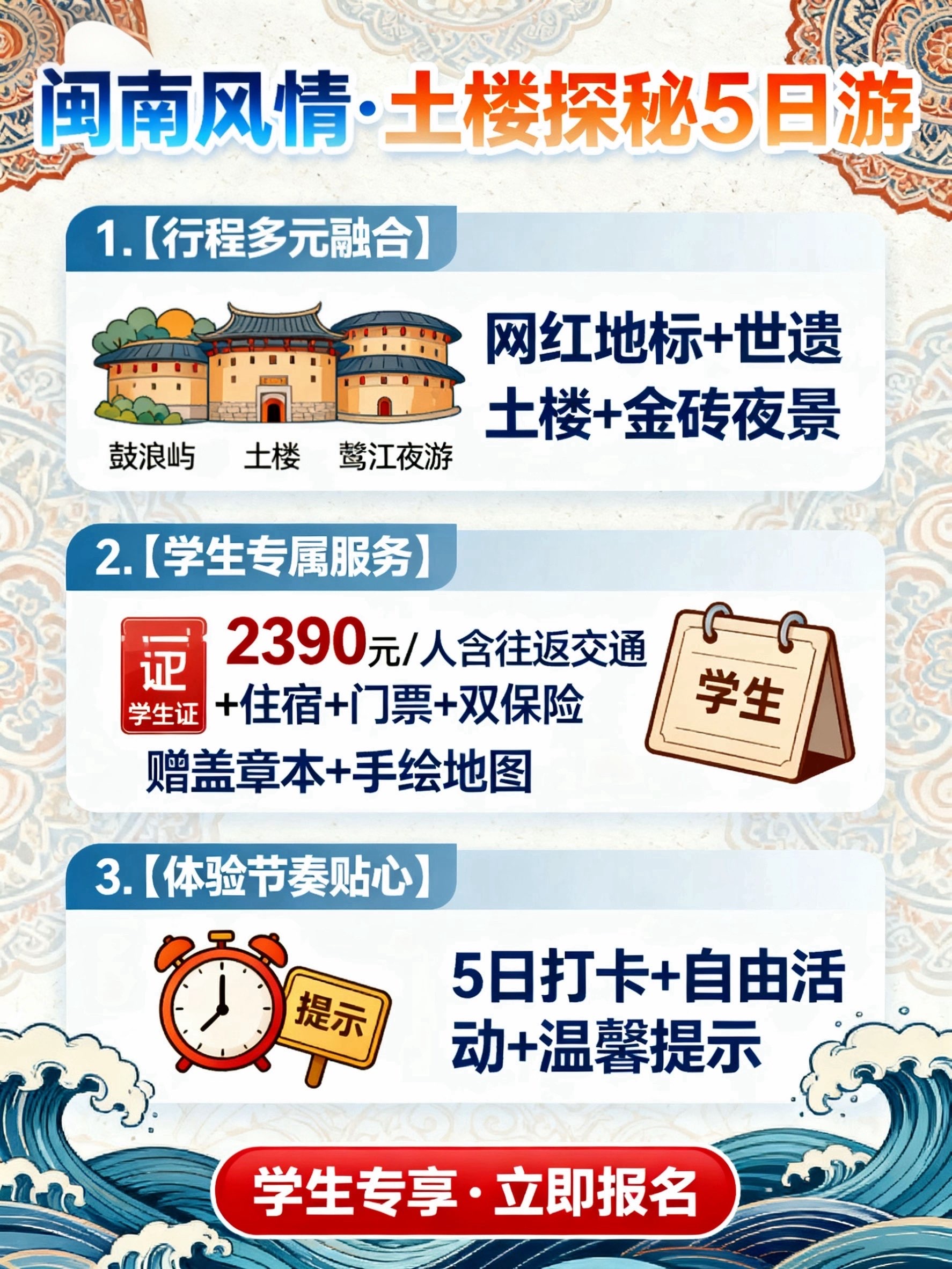 2. 学生专属品质服务:2390元/人的学生优惠价,含长沙厦门往返交通(经济舱机票+高铁返程)、经济酒店住宿、持证国语导游讲解、行程首道大门票及双保险;鼓浪屿赠送家庭盖章本、手绘地图,增添旅游纪念趣味。