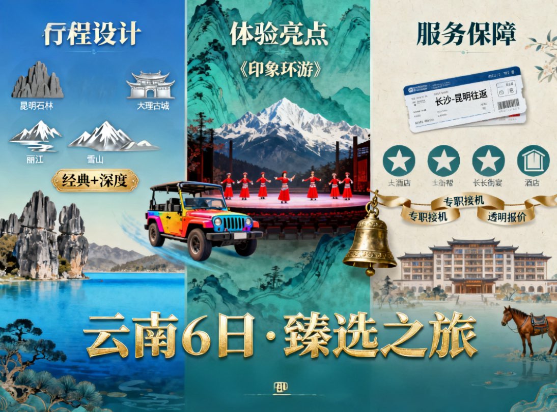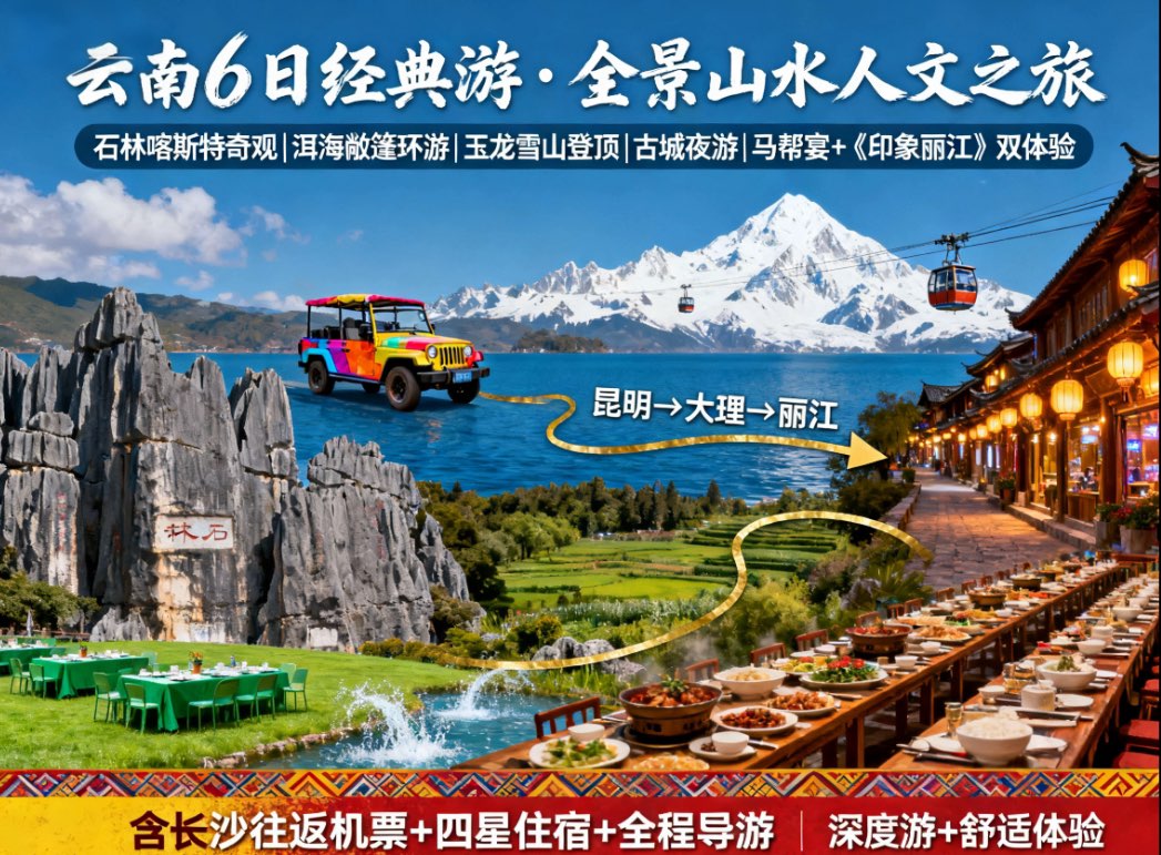 • 行程节奏合理:既有石林、玉龙雪山、大理古城等核心景点的深度游览(如石林游览2.5小时、玉龙雪山含冰川大索道体验),也安排了《印象丽江》演出、《送别宴》等特色活动,同时穿插自由活动时间(如丽江自由活动、大理古城闲逛),避免行程过于紧凑。