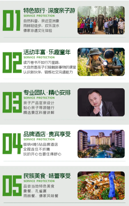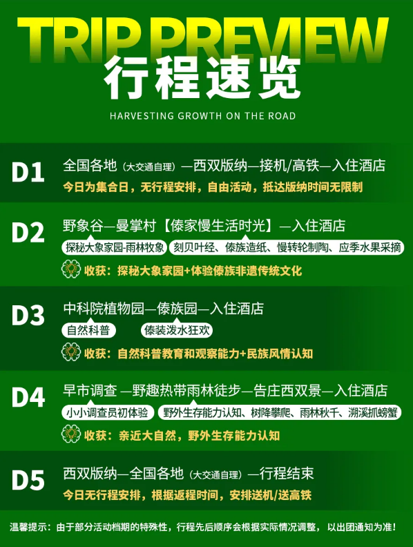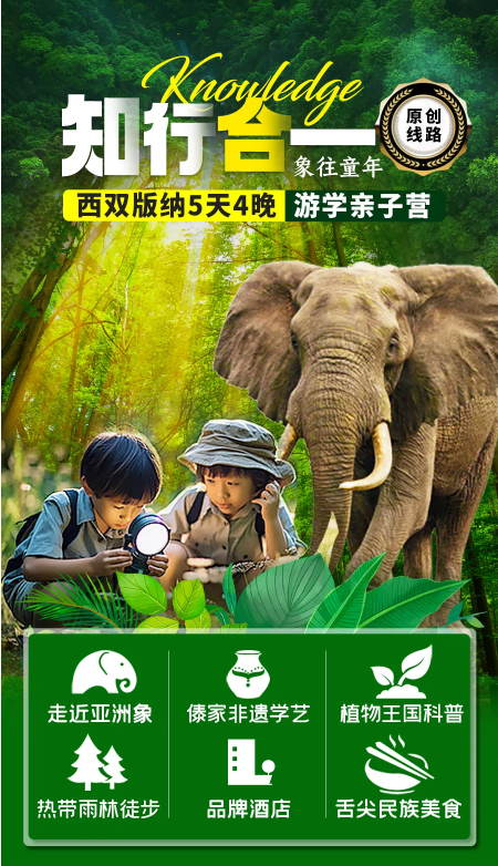 | 门票及地面项目 | 行程所列景点首道大门票景区门票:中科院植物园(含西区电瓶车)、野象谷(不含索道)、傣族园(含电瓶车)活动费:野象谷雨林牧象、傣寨非遗学艺(刻贝叶经、造纸、制陶、水果采摘)、自然笔记、雨林徒步、早市调查、泼水狂欢 | 行程中所列景点/场馆首道大门票景区门票:中科院植物园(含西区电瓶车)、野象谷(不含索道)、傣族园(含电瓶车)活动费:野象谷雨林牧象、傣寨非遗学艺(刻贝叶经、造纸、制陶、水果采摘)、自然笔记、雨林徒步、早市调查、泼水狂欢 |