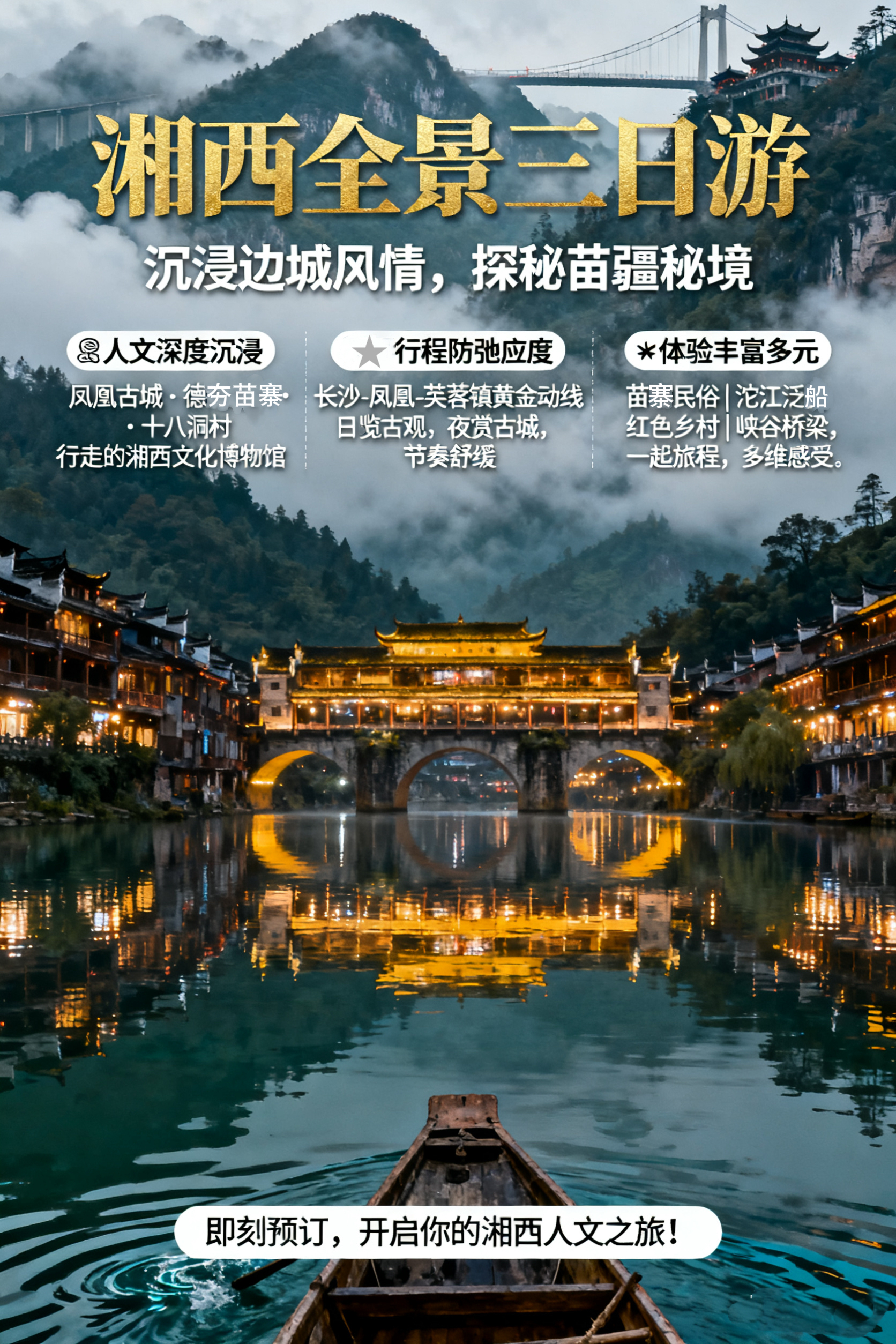 早上指定时间指定地点集合出发,前往在沈从文笔下能读到,在黄永玉的画中能看到,在宋祖英歌里能听到,被新西兰著名作家路易•艾黎称赞为中国最美的小城【凤凰古城】(正常行驶时间6小时),随着导游一起游览【沱江下游游船】(门票已含),坐上农家小船欣赏凤凰古城沱江下游的风光。凤凰古城农家船景区可用“一江、两岸、三品、四桥”来表述。“一江”,既凤凰沱江母亲河。“两岸”,既凤凰沱江边的接官道和柳林游道。“三品”,既景区的三个旅游产品:休闲景观游,竞技体验游,夜景怡情游。“四桥”,凤凰景区内的四座桥:情人桥启航、雾桥发呆、廊桥遗梦、红桥怀旧。后乘车前往参观【民俗晚会】(门票已含),通过实景舞台、情景舞台、悬崖舞台打造中国首创360度全景体验剧。晚餐后在酒店休息或自由活动,也可自费欣赏《魅力湘西》大型演艺(228元/人起,观看时间不少于1.5小时),感受神秘湘西的千年巫傩文化,探寻屈原笔下诡异的楚风遗俗,神秘的湘西赶尸,评鉴中国入座排行第一的旅游视听盛宴。