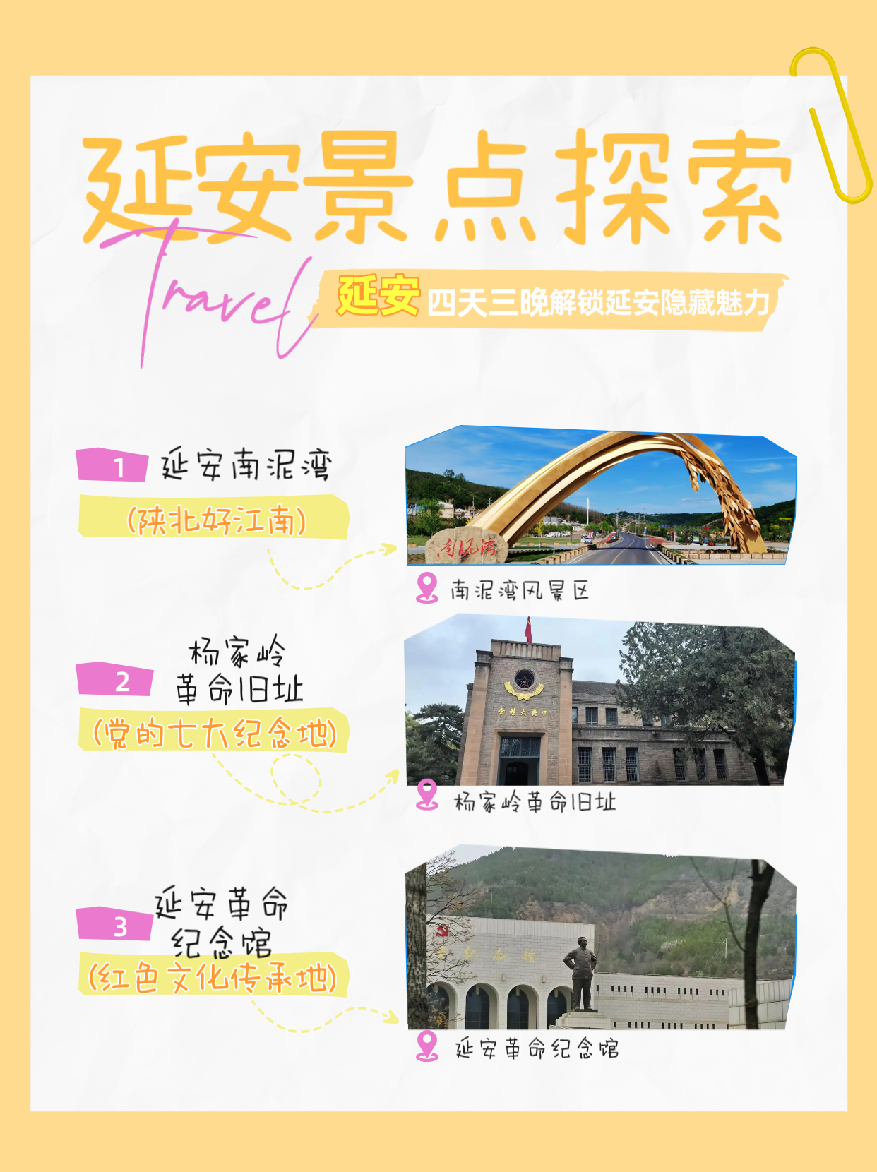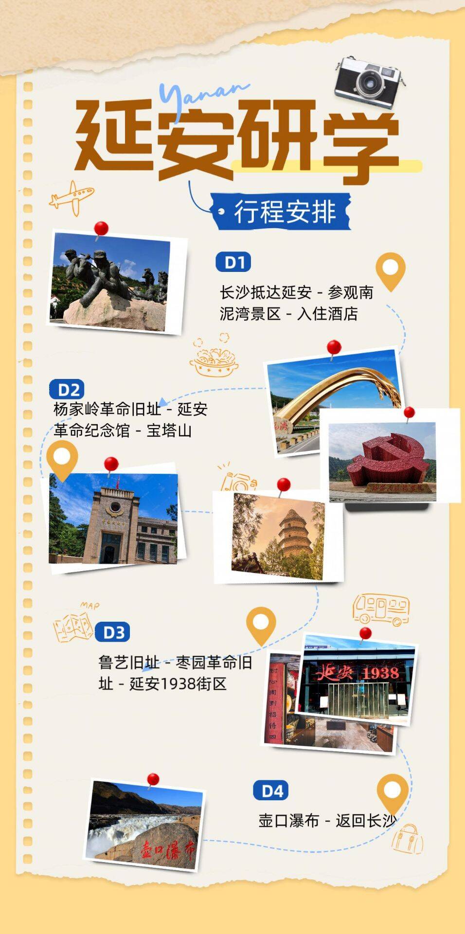 早上8:00吃完早饭,驱车前往杨家岭革命旧址(车程约:0.2h),杨家岭(浏览时长约:1.5h)是中共中央在延安时期的核心驻地,党的“七大”曾在此举办,在这里组织学生模拟“延安文艺座谈会”“投豆选举”等历史场景,体验民主决策过程。并安排学生在毛泽东菜地参与种植活动,感受大生产运动的艰辛与智慧。然后前往延安革命纪念馆(车程约:0.1h),馆内陈列直观呈现中国共产党在延安时期的奋斗历程,通过参观毛泽东、周恩来等领导人的窑洞旧址,理解“延安精神”的当代价值,激发奋斗动力。纪念馆内含有红色文物互动课堂与情景剧观看,可以更深印象地触摸历史(浏览时长约:2h)。、