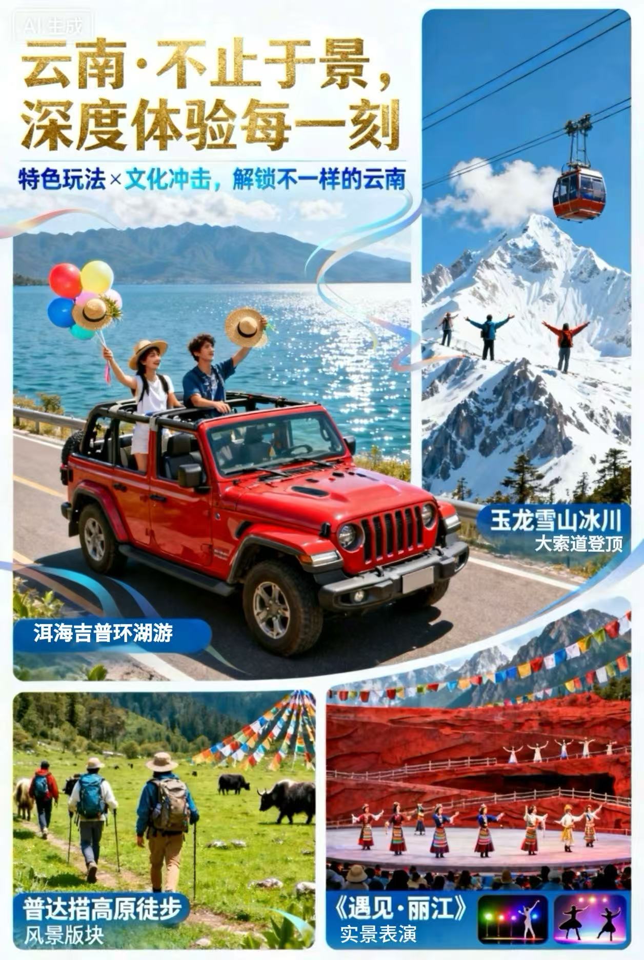2. 特色玩法与深度体验突出:包含差异化体验项目,如洱海敞篷Jeep车环海(含网红道具打卡)、玉龙雪山冰川大索道登顶、普达措高原徒步,避免常规走马观花;同时安排《印象丽江》《遇见·丽江》两大实景演出,强化视觉与文化冲击。