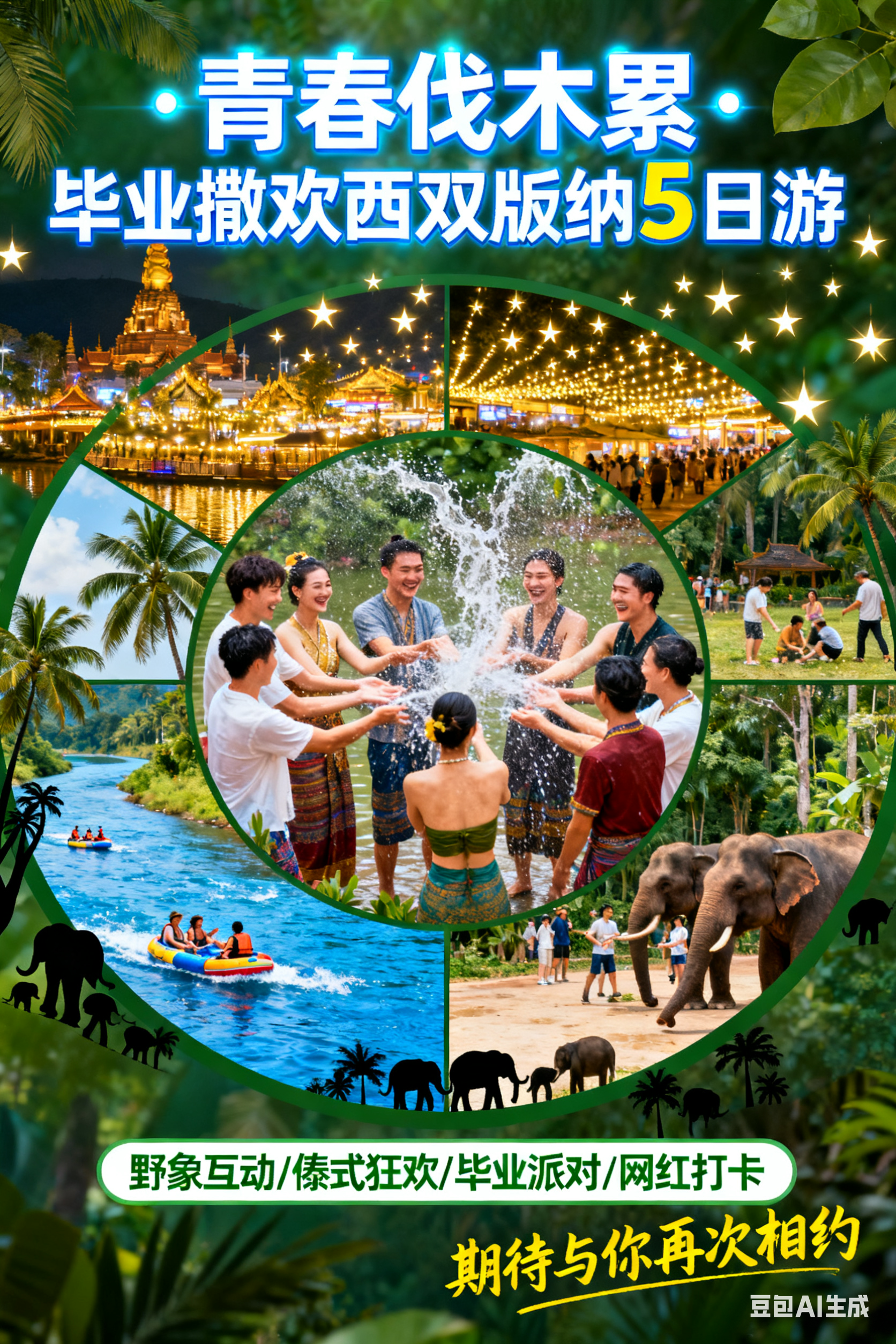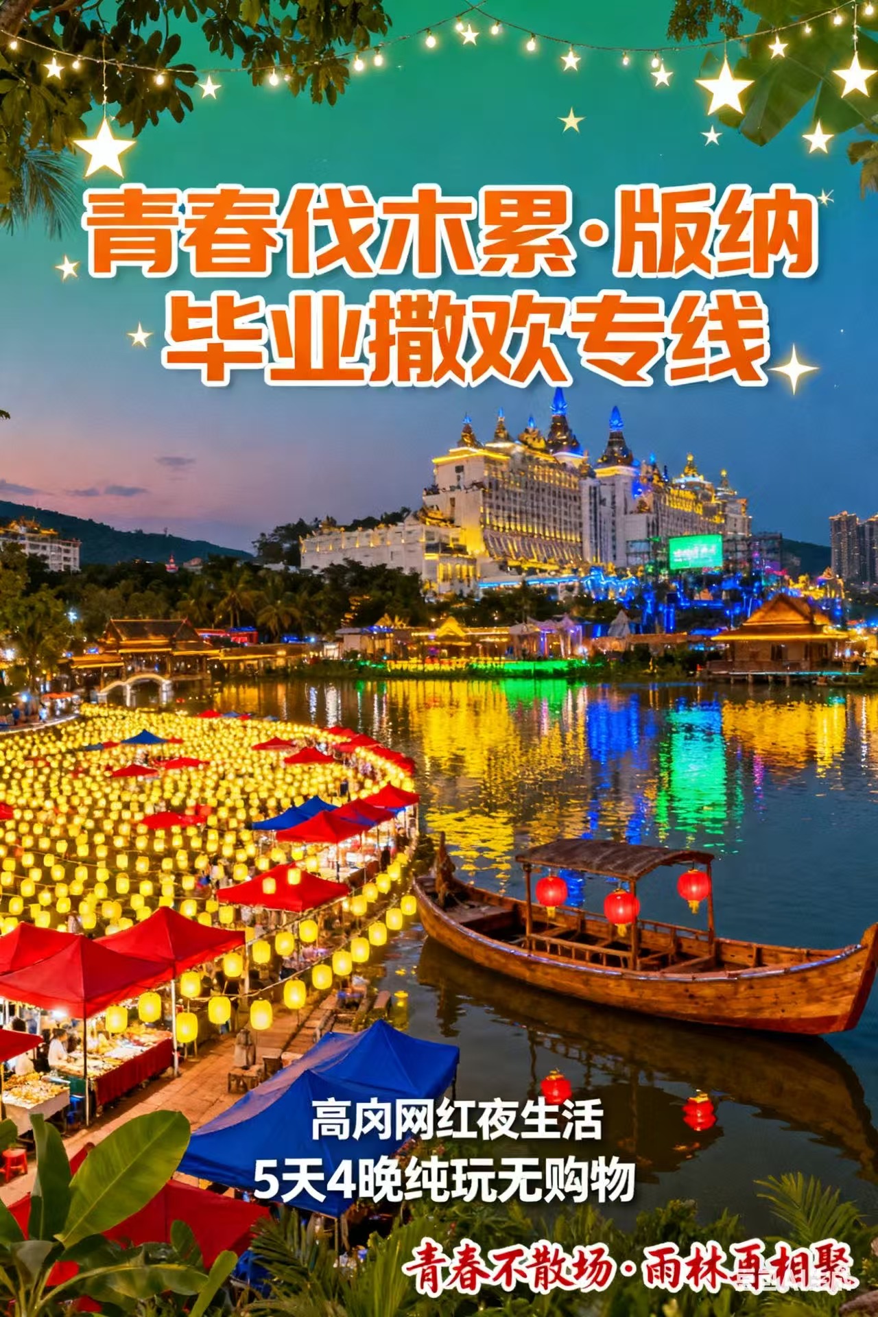 下午:漂流至雨林部落风情岛(聚居僾尼族、傣族等),体验赠送的天然氧吧骑马活动、僾尼族夹脚舞及其他特色活动;活动结束后,前往江边音乐餐吧参加毕业 party(可唱歌、跳舞、分享心情);随后入住告庄泳池客栈,可选择泳池游泳,或游览告庄西双景(打卡星光夜市、六国水上集市)。