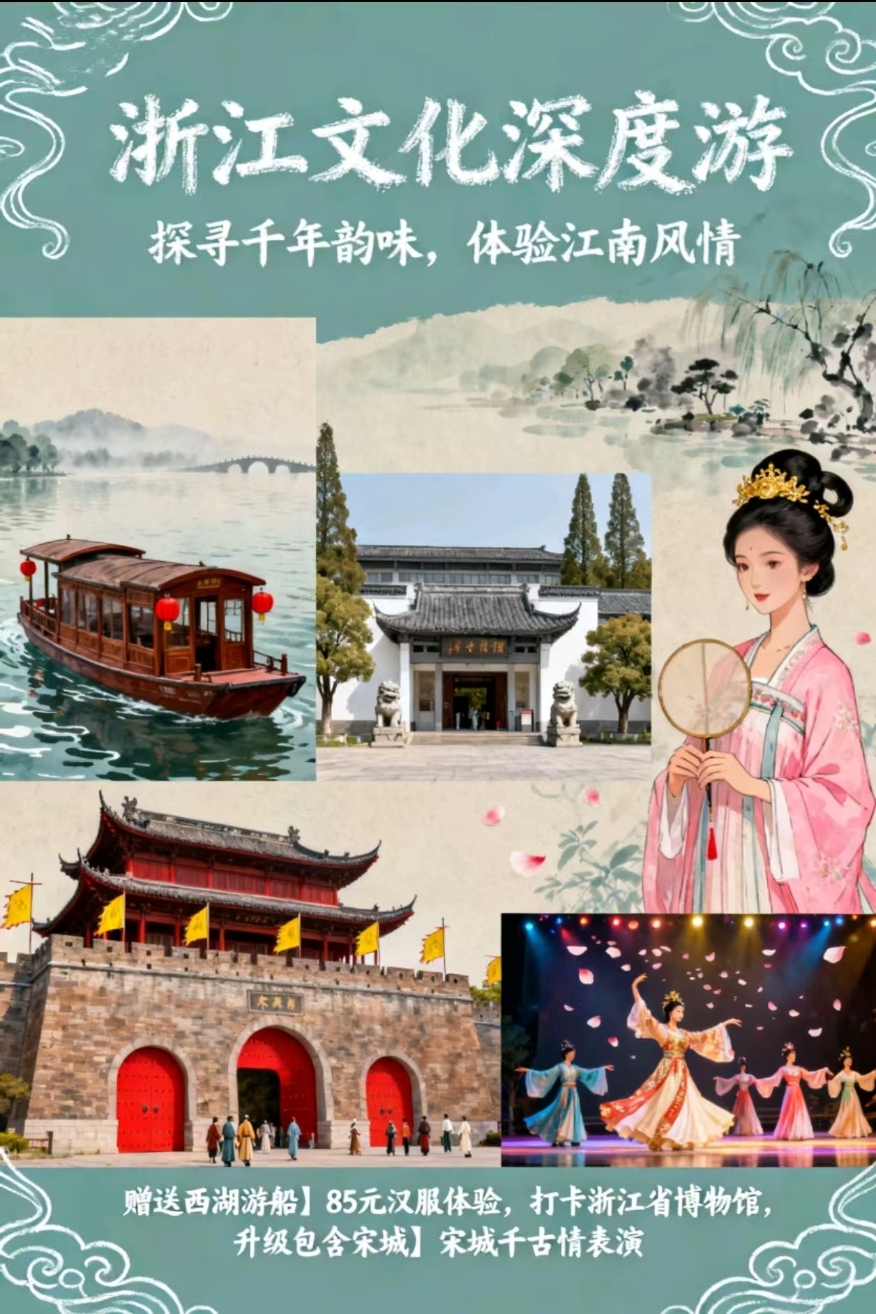 门票 | 西湖 中国丝绸博物馆 扎染工坊 龙井村 宋城景区《千古情演出》 乌镇 体验扎染DIY 木心美术馆 鲁迅故居、沈园 《陆游与唐琬》 兰亭 | |