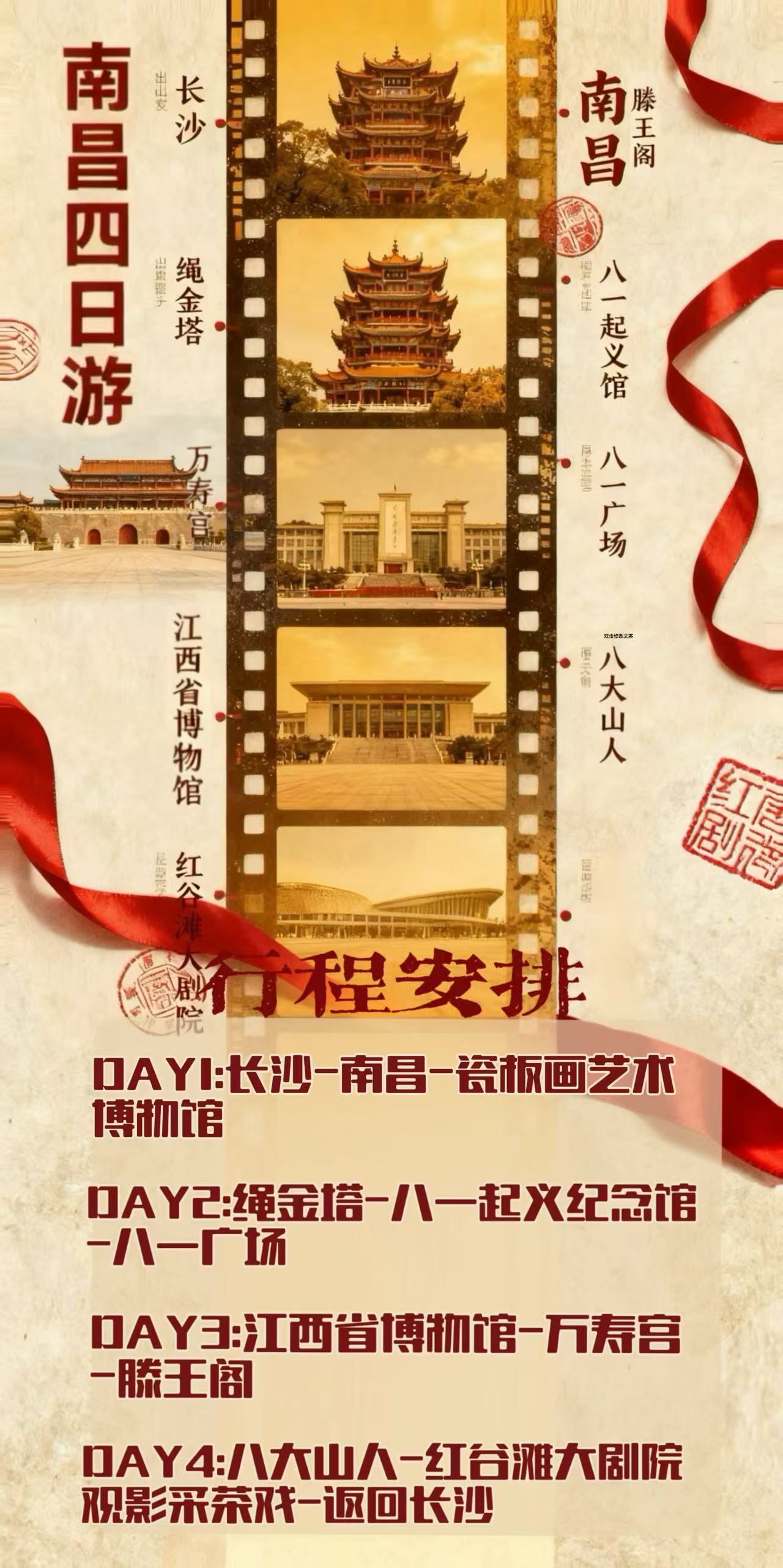 午餐过后下午13:00驱车(行驶时间0.5h),前往江西省最大的综合性博物馆【江西省博物馆】(游览时间3h),随后驱车前往【滕王阁】(游览时间1.5h),滕王阁作为江南三大名楼之一,以其壮观的建筑和深厚的文化底蕴吸引着无数游客。
