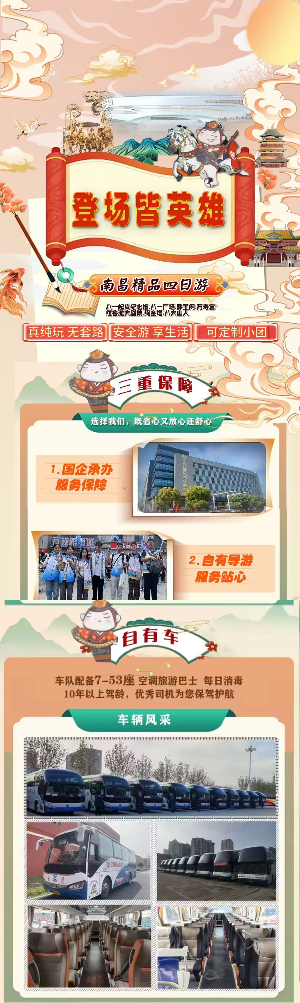 午餐过后下午13:30后驱车(行驶时间0.2h)前往被誉为“军旗升起的地方”【南昌八一起义纪念馆】(游览时间约:3h),是为了纪念1927年南昌起义这一重大历史事件而建立的纪念馆,后驱车(行驶时间约0.4h)前往【八一广场】(游览时间约1h),八一广场作为南昌市的城市心脏和红色地标,以纪念“八一南昌起义”为核心,集历史纪念、政治庆典、市民休闲为一体。晚餐过后返回酒店休息。