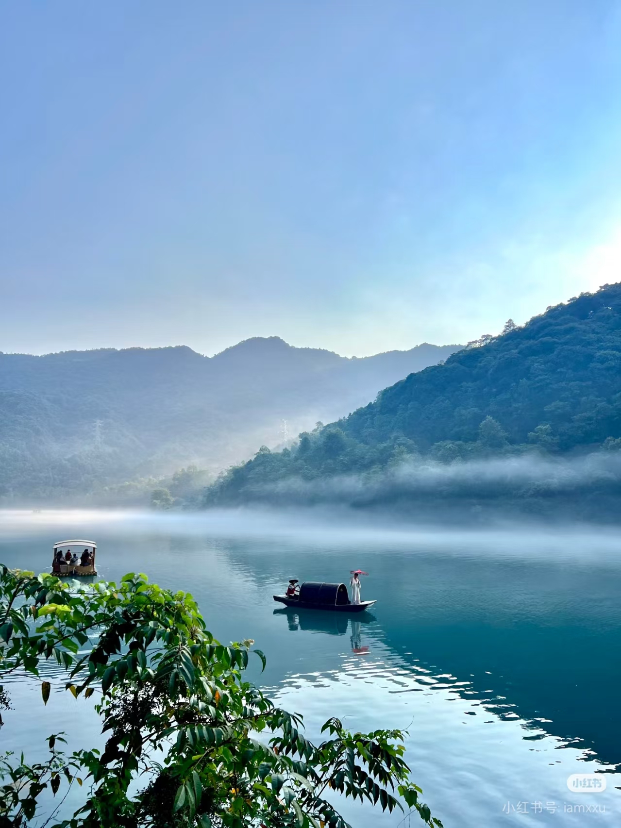 小东江4-10月的清晨,江面因温差效应弥漫着薄雾,宛如仙境。渔翁身着蓑衣,划着乌篷船定时撒网,每隔15分钟一次,与雾景相映成趣,1号和3号观景台是最佳打卡位。此外,1号和2号观景台之间的浮桥栈道上,早上还有古装小姐姐表演跳舞、弹古筝,仿佛穿越到仙侠世界。