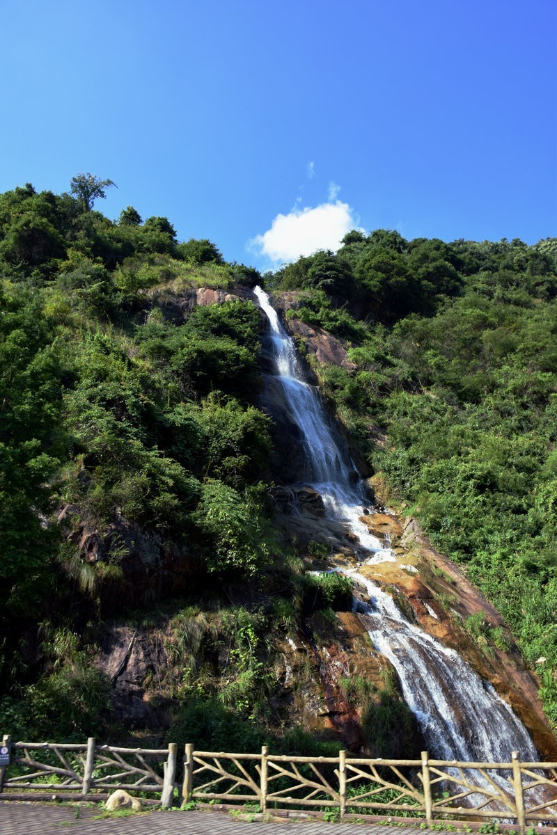 猴古山瀑布由两道瀑布组成,它们相距近百米,分别位于东江大坝附近的西南山弯之中。 其中,由两个壮观的瀑布组成,西面大瀑布水流直泻,南面“百丈瀑”如银河落入东江湖,两道瀑布相映成趣。