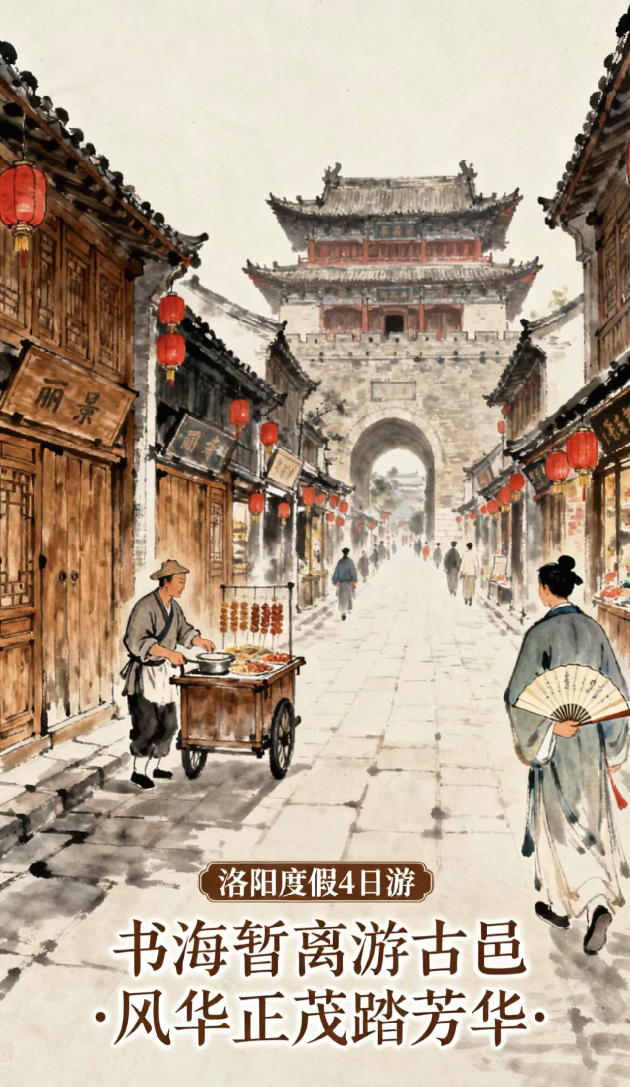 午餐后下午2:00驱车(行驶时间约:2.5h)前往【洛邑古城】(游览时间约:2h),青石板路蜿蜒,飞檐斗拱间尽显古韵。漫步古街,看雕梁画栋与灯笼相映,驻足非遗工坊,亲手体验唐三彩绘制,在时光慢流中触摸传统技艺的温度,晚餐后回酒店休息。