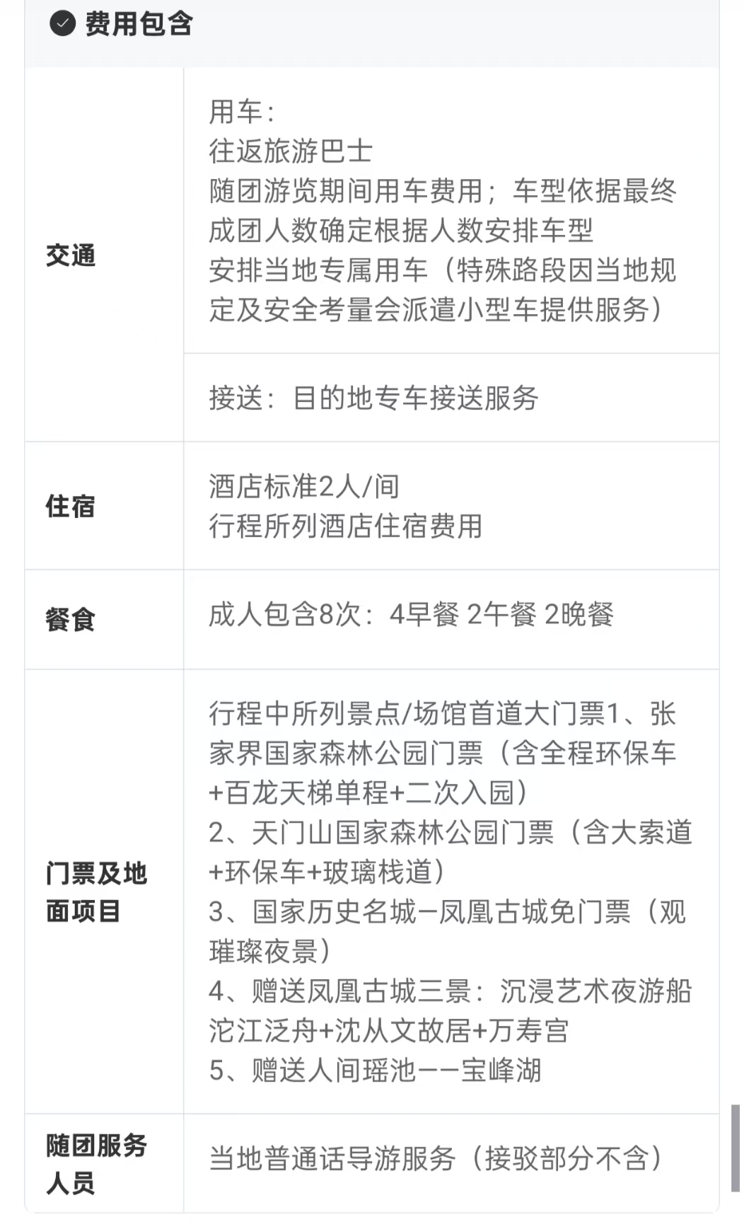 乘车赴【天门山国家森林公园】,乘高山客运索道(长7.5公里)往返价值213元(赠送),走玻璃栈道,远观鬼谷洞;拜求儿洞;游天界佛国天门山寺;乘观光汽车体验公路奇观“99弯通天大道”的奇绝;登999级天梯或乘扶梯至天然穿山溶洞“天门洞”体验自然造化的神奇和震撼。下午乘车赴湘西,游览挂在瀑布上的土家第一镇-【芙蓉镇】(电瓶车28元/人自理),该镇美誉为:“中国历史文化名镇”、“挂在瀑布上的千年古镇”、“中国十大美丽乡镇之一”“土家之源、土家之都”、“最朴实最美妙的影视拍摄基地”,后赴凤凰入住酒店,可自由欣赏凤凰夜景。