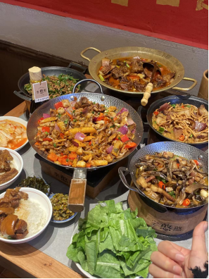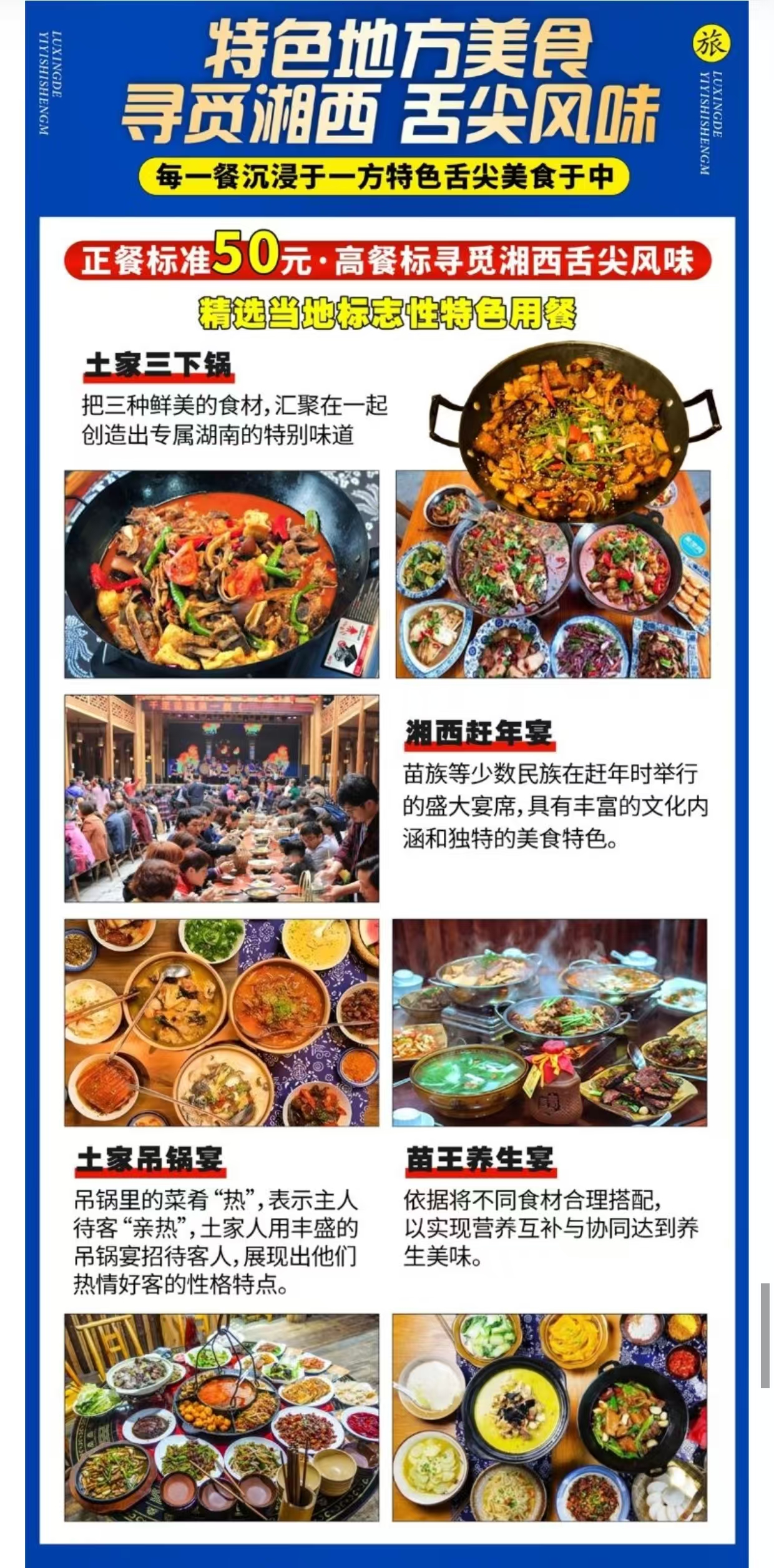 中餐升级为特色风味餐“三下锅”,张家界头牌菜,2009年荣登湖南14市州故乡菜之首。传明代嘉靖年间,朝廷征调湘鄂西土司兵上前线抗倭,恰好赶上年关,为不误军机,土司王下令提前—天过年,于是腊肉、豆腐、萝卜一锅煮,叫吃“合菜”,逐演变成“三下锅”。