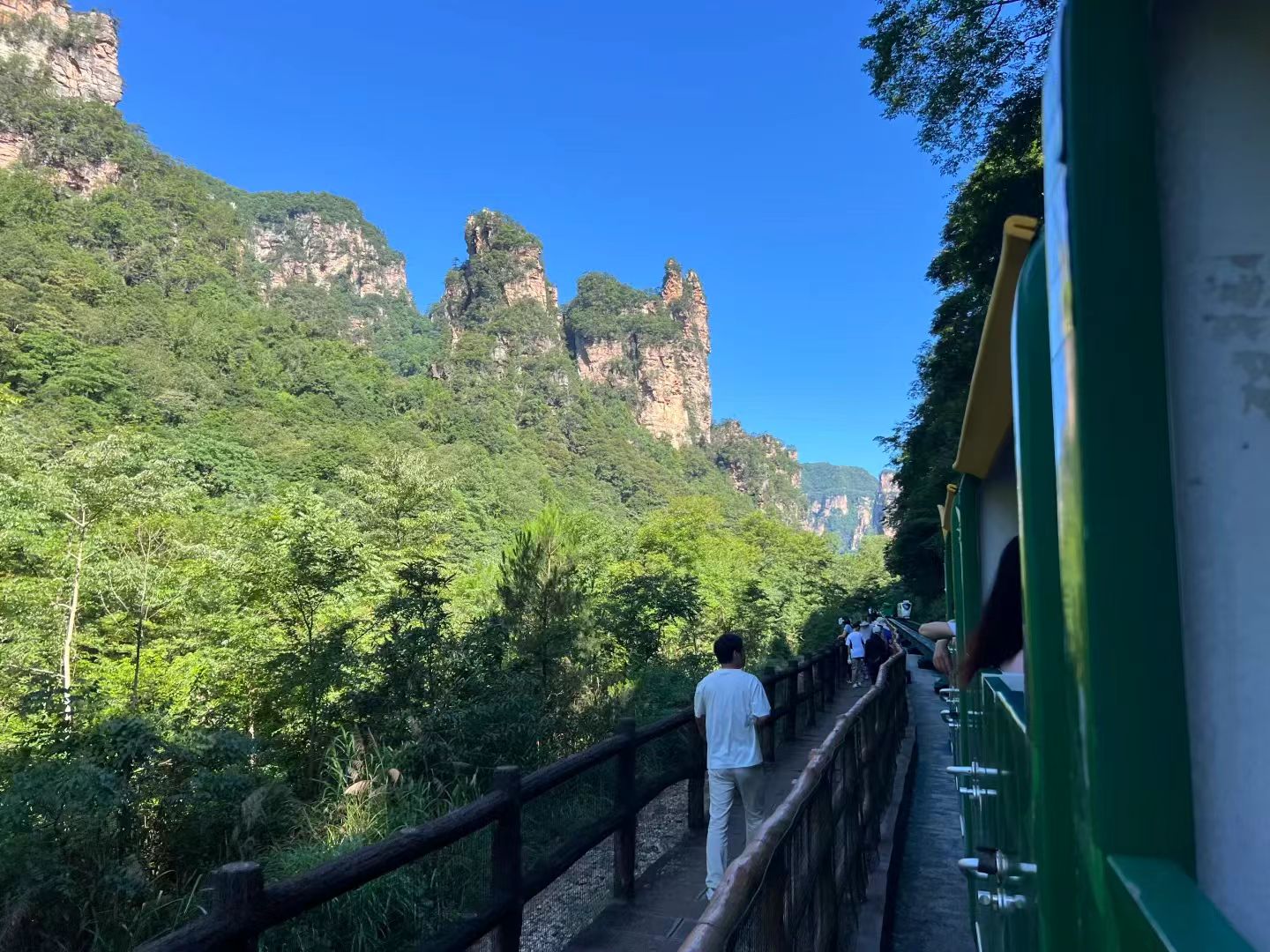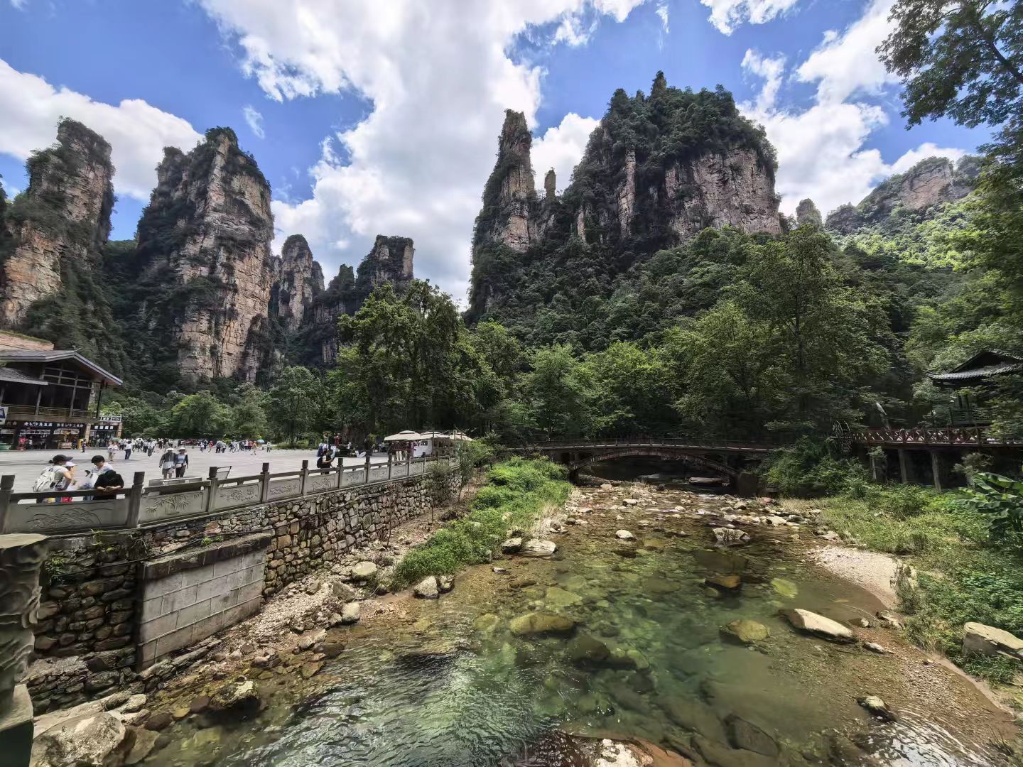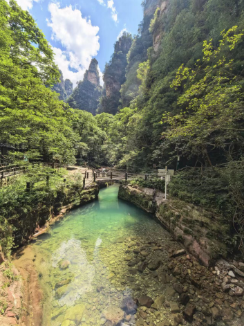 游览【张家界国家森林公园】-因溪水流经金鞭岩而得名的【金鞭溪】:张家界的黄金旅游区,水绕四门,蜿转曲折,幽静异常,随山而移,穿行在峰峦幽谷云间,迤逦延伸于鸟语花香之中(游览时间不少于2小时),车返市区,下午乘车返回张家界市区后自由活动(正常行车时间1小时,全程县道)。