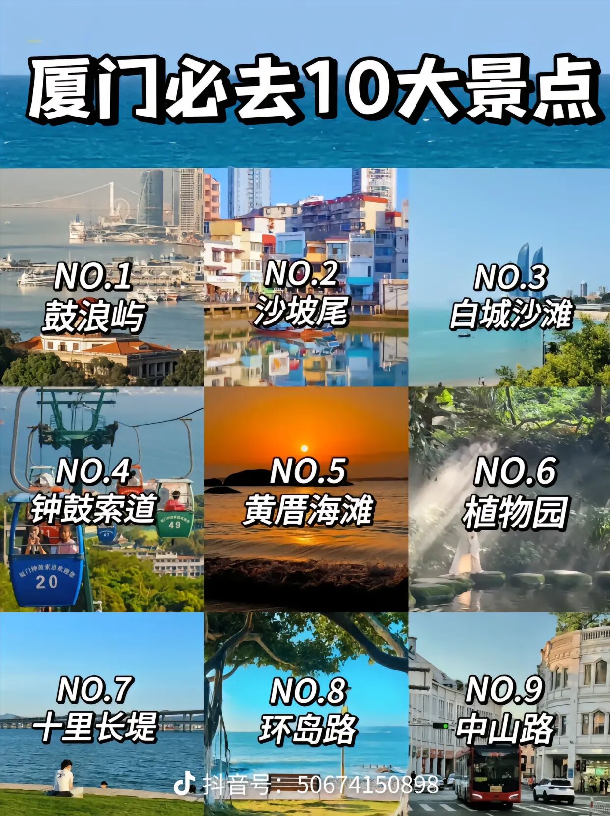 车览[彩色环岛路]沿海而建,全程31公里,路宽44-60米,本地人又叫它五色路:蓝色的大海、金色的沙滩、绿色的草地、红色的跑道、灰色的公路,它是来厦门必去的一- 个地方。前往游览环岛路上的美丽小渔村[曾厝垵]这里没有鼓浪屿的嘈杂,没有市区的蔡华,也没有一-波接- 波的游客,有的只是质朴的民居和文艺小清新的店面,当然,还有不混乱的酒吧。如果说选一个值得 留念的地方,那么会想:一定是它一曾 厝按。