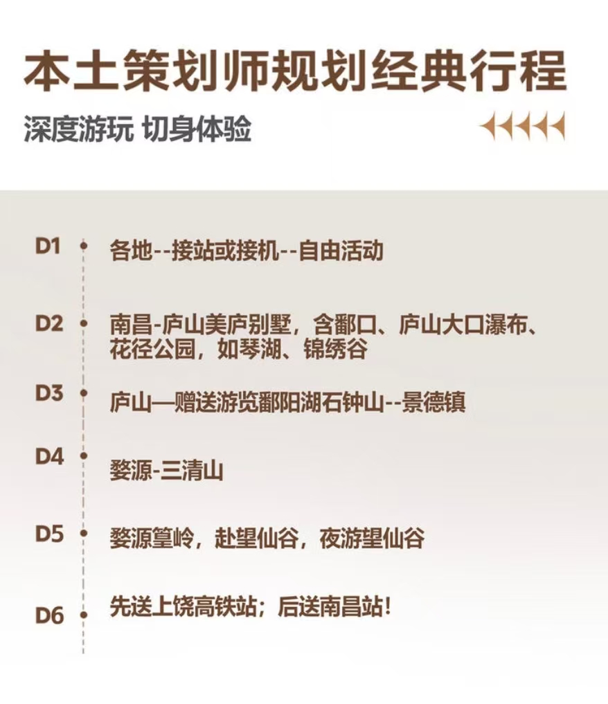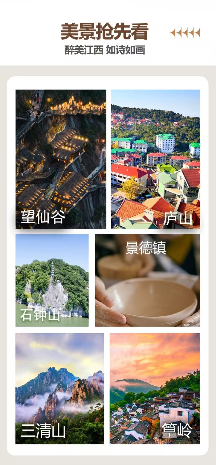 6、行程中所列景点/场馆首道大门票庐山大门票、望仙谷门票、三清山大门票、婺源篁岭门票