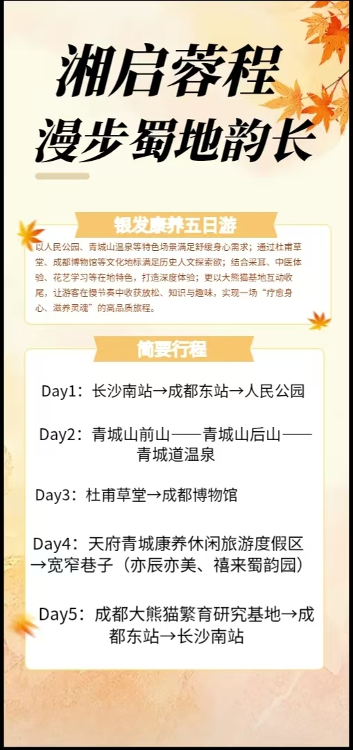 上午:从长沙南站乘坐 G2181(8:47---15:54)(7h)抵达成都东站。高铁上可 以提前看看成都的旅游攻略,或者闭目养神,为接下来的行程养精蓄锐。到达成 都东站后,前往提前预订好的青城慈居酒店办理入住,放下行李,稍作休息,缓 解旅途疲劳。