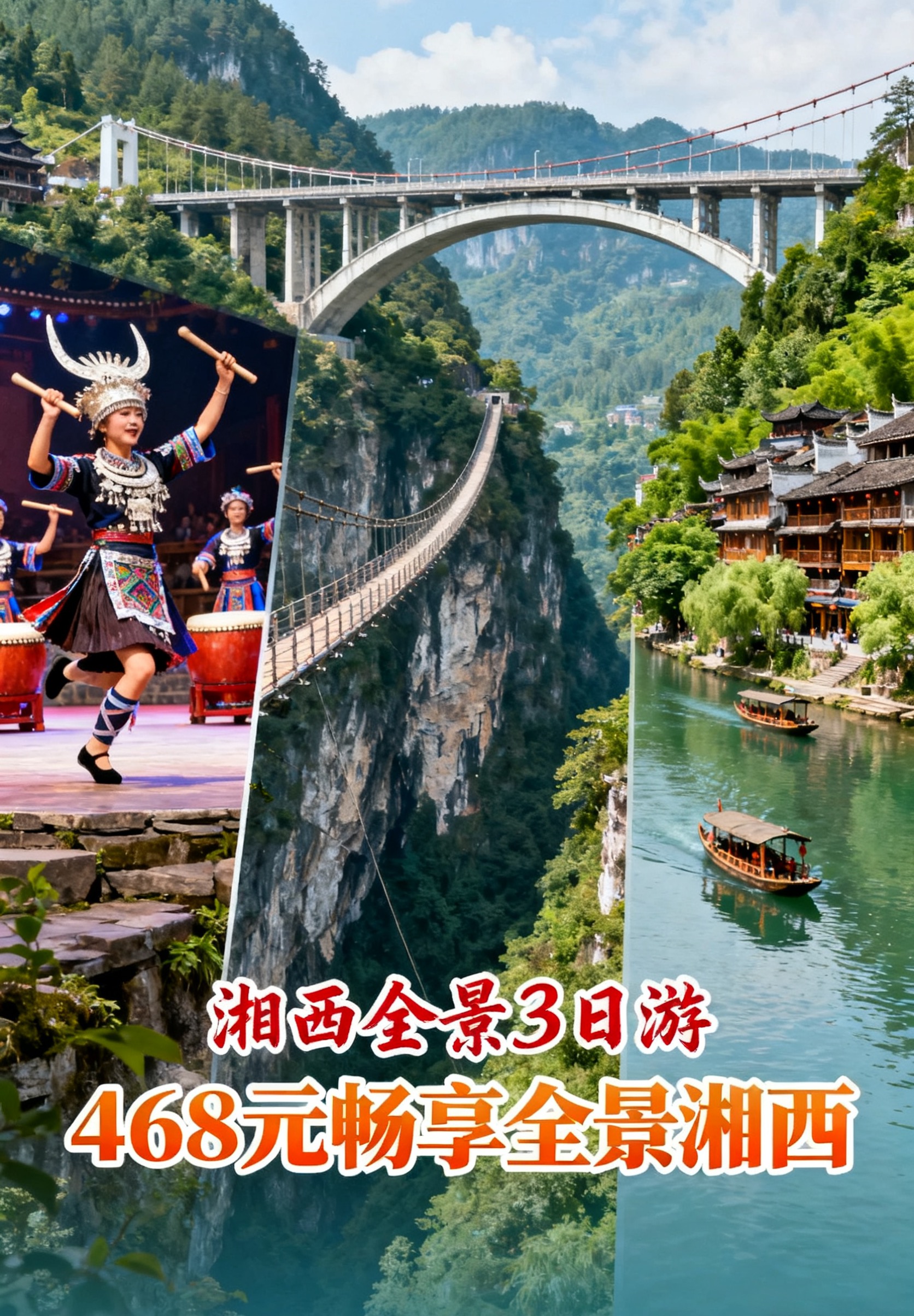 畅享湘西全景3日游,串联凤凰古城、矮寨大桥等核心景点,含门票与交通住宿,兼具自然奇观与民俗体验,高效解锁湘西魅力