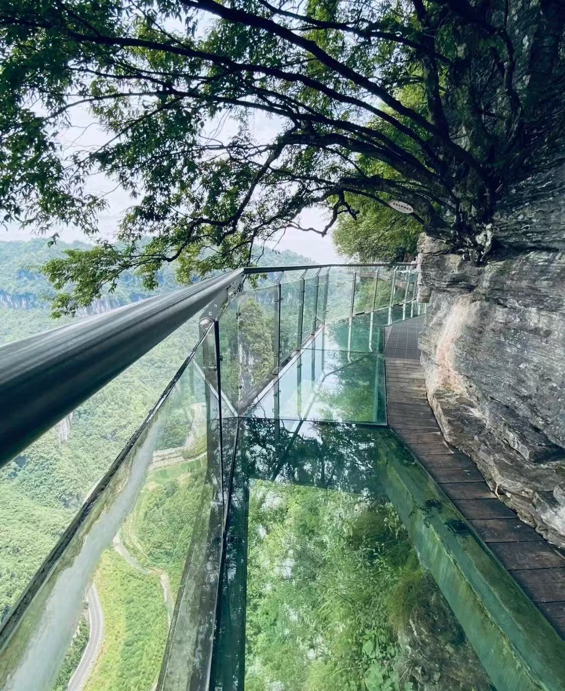 早起后,乘车前往吉首,参观【湘西丝绸博物馆】(参观时间90分钟)。后乘车前往矮寨奇观景区,游览【悬崖栈道】(门票已含),全长1.5公里,垂直落差500米,采用现代设计语言,萃取“蝴蝶”、“飘带”等苗族文化元素,以期形成戏剧性“跌宕起伏”、“惊心动魄”的旗帜性游步道系统。游览悬崖栈道时不仅可以欣赏到山高谷深、崖陡壁俏、林深路幽、巍峨险峻的武陵山脉中最精彩、最险峻、最梦幻的地段,更有天桥(矮寨大桥)、天路(公路奇观)、天台(天问台)交相辉映、互为景致,移步入云,一步一景,构成人文与自然共生,壮丽于精巧同在的峡谷奇观。后至【矮寨大桥】(门票已含),乘观光电梯至大桥观光通道,近距离观亚洲第一的斜拉式铁索桥矮寨大桥,桥面设计标高与地面高差达330米左右。桥型方案为钢桁加劲梁单跨悬索桥,全长1073.65m。悬索桥的主跨为1176m。该桥跨越矮寨大峡谷,主跨居世界第三、亚洲第一。矮寨公路奇观一览无余,让您美景中感叹的祖国的强大。