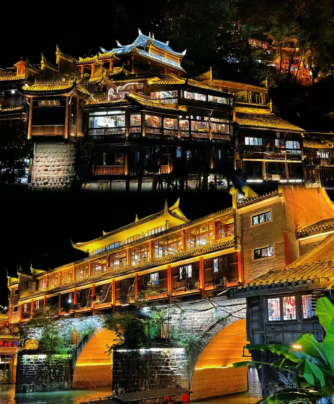 晚上漫步在灯光下的古城中,可以在各个小店或者婆婆们的摊位上一尝古城特色小吃:湘西腊肉,血粑鸭,酸辣子粑粑,米豆腐,虾饼,苗家酸萝卜,蒿子粑粑……也可以捧一杯啤酒,坐在沱江边的酒吧中,吹着江风,听着酒吧那或清雅或摇滚的音乐,感受着古城的独特风情!凤凰古城特色酒吧:三十九度吧,愚人码头,湘西往事等等。